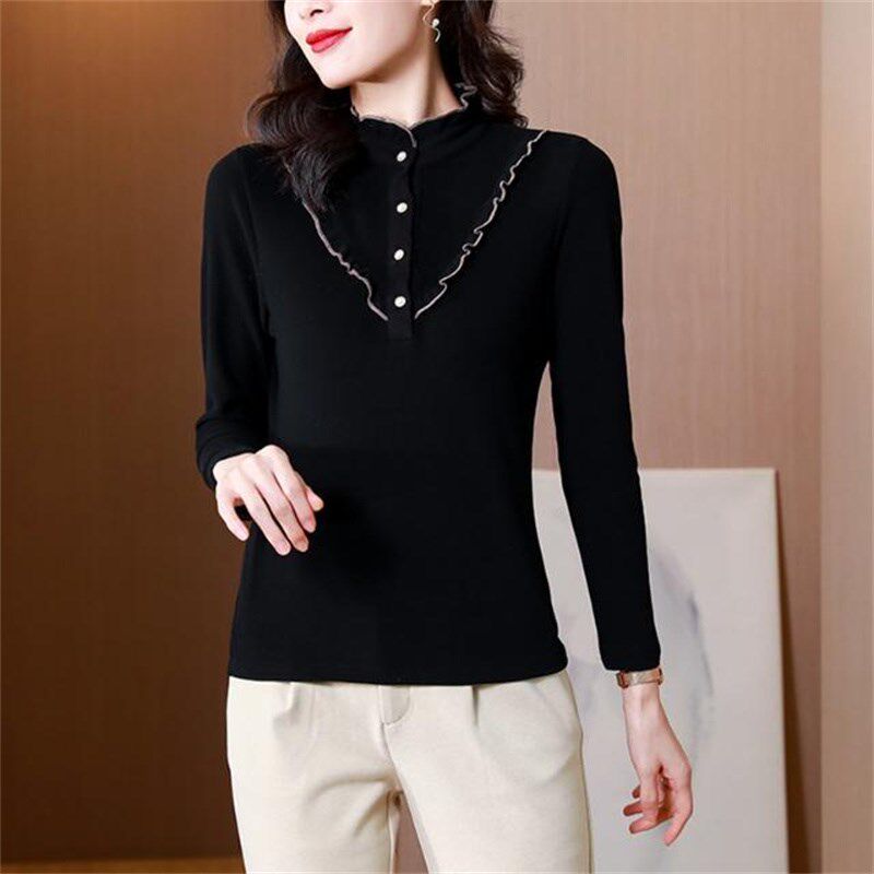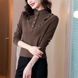 长袖 洋气中年妈妈加绒加厚大码 t恤上衣 女秋冬内搭新款 立领打底衫