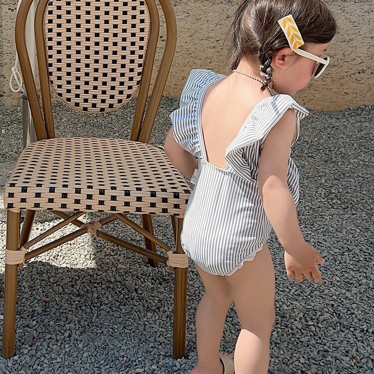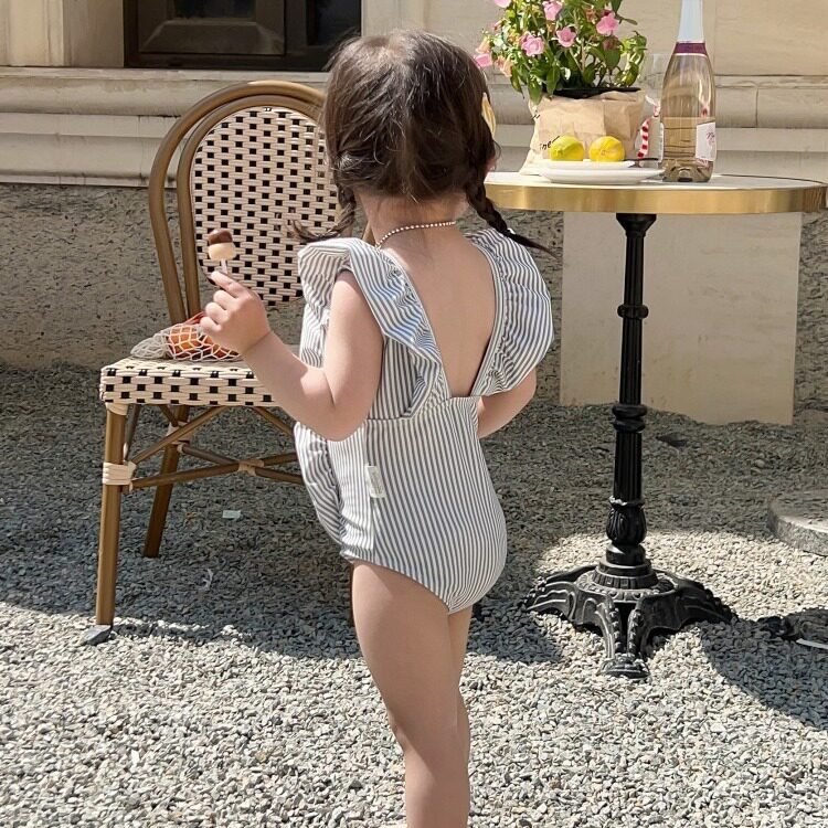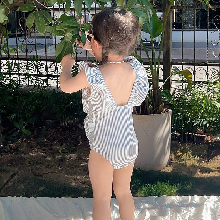 宝宝ins度假风无袖 条纹连体泳装 花边游泳衣 韩版 女童泳衣女孩新款