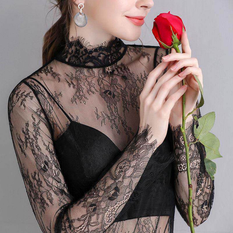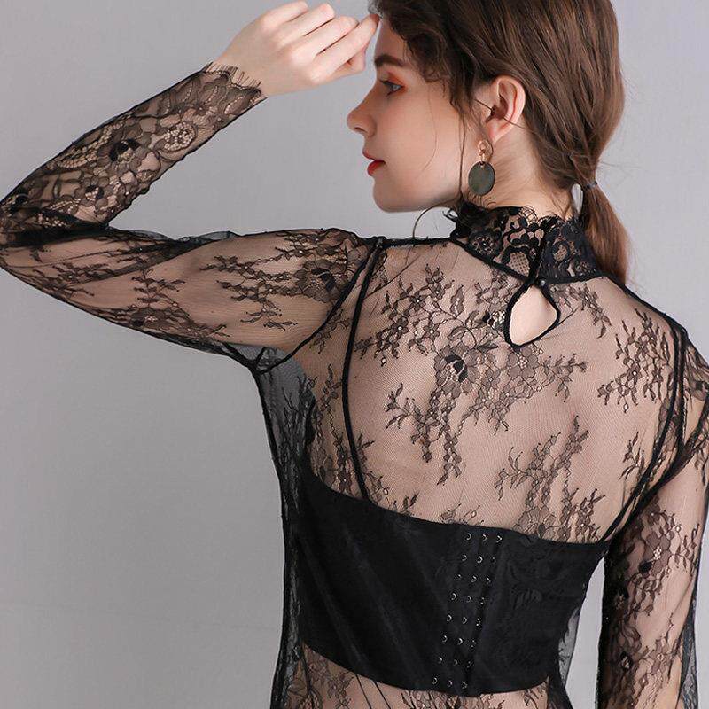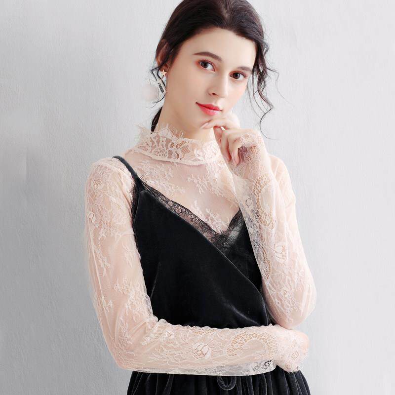 内纱剪裁大尺寸蕾丝底0322z 时尚 春夏白色网眼女式 上衣薄纱长袖