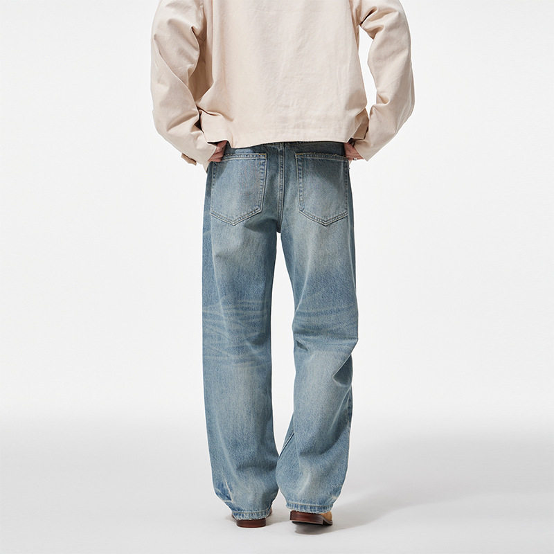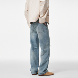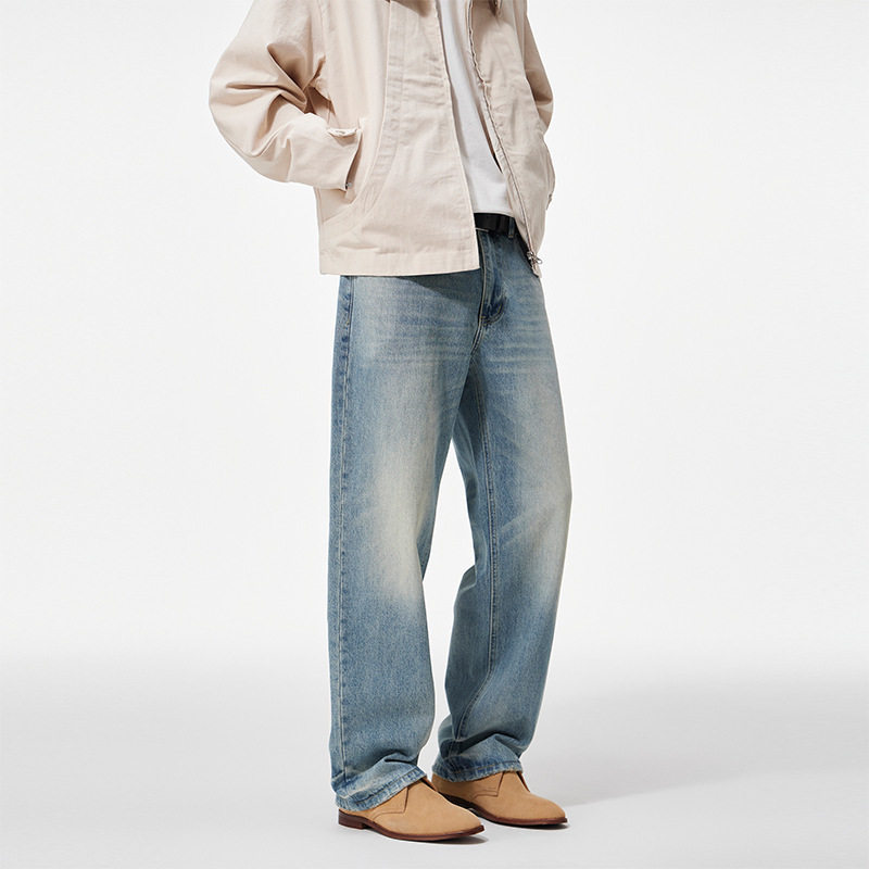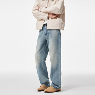 宽松阔腿马骝休闲长裤 男士 Clanfit浅蓝色水洗复古直筒牛仔裤 秋季