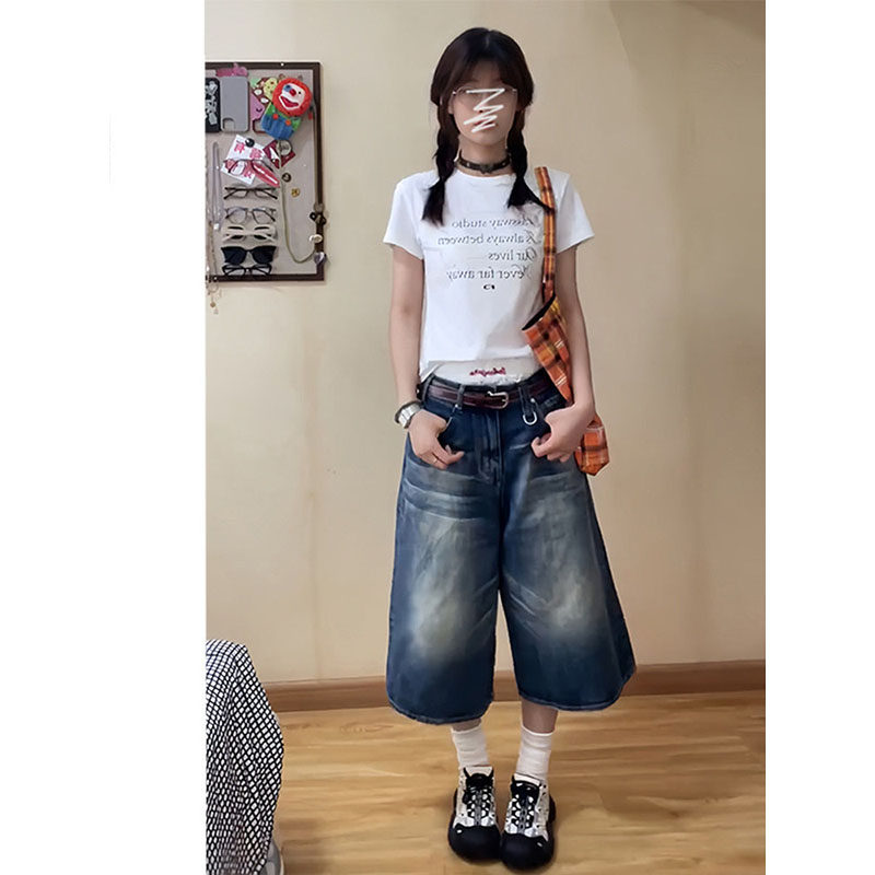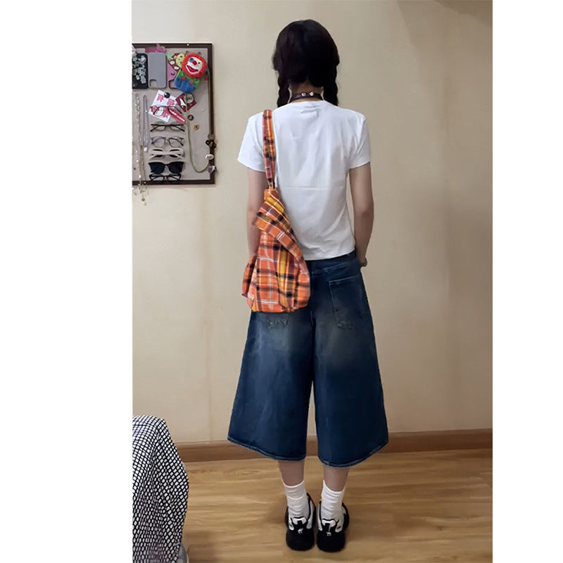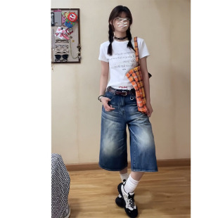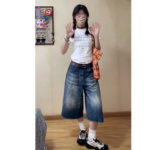 高腰显瘦直筒宽松辣妹阔腿中裤 美式 牛仔短裤 女夏季 子潮 做旧七分裤