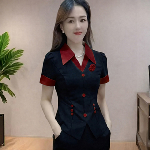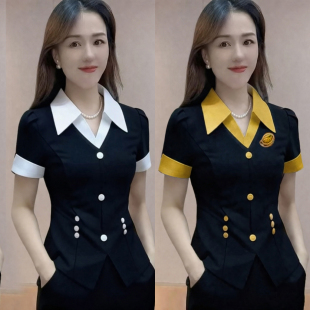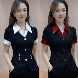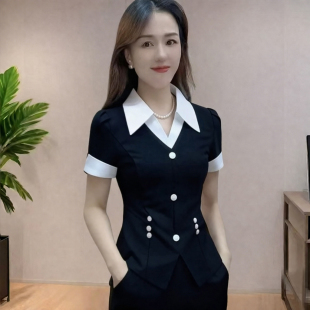 显瘦OL拼接衬衫 修身 领名媛气质短袖 上衣微喇裤 夏季 两件套装 韩版