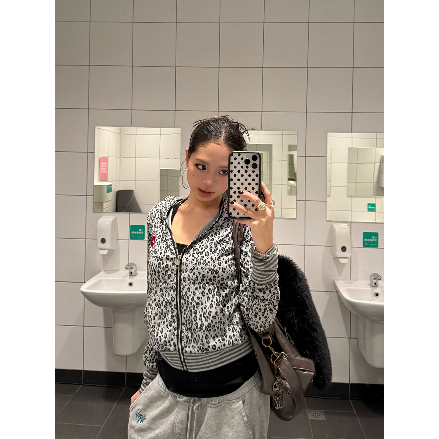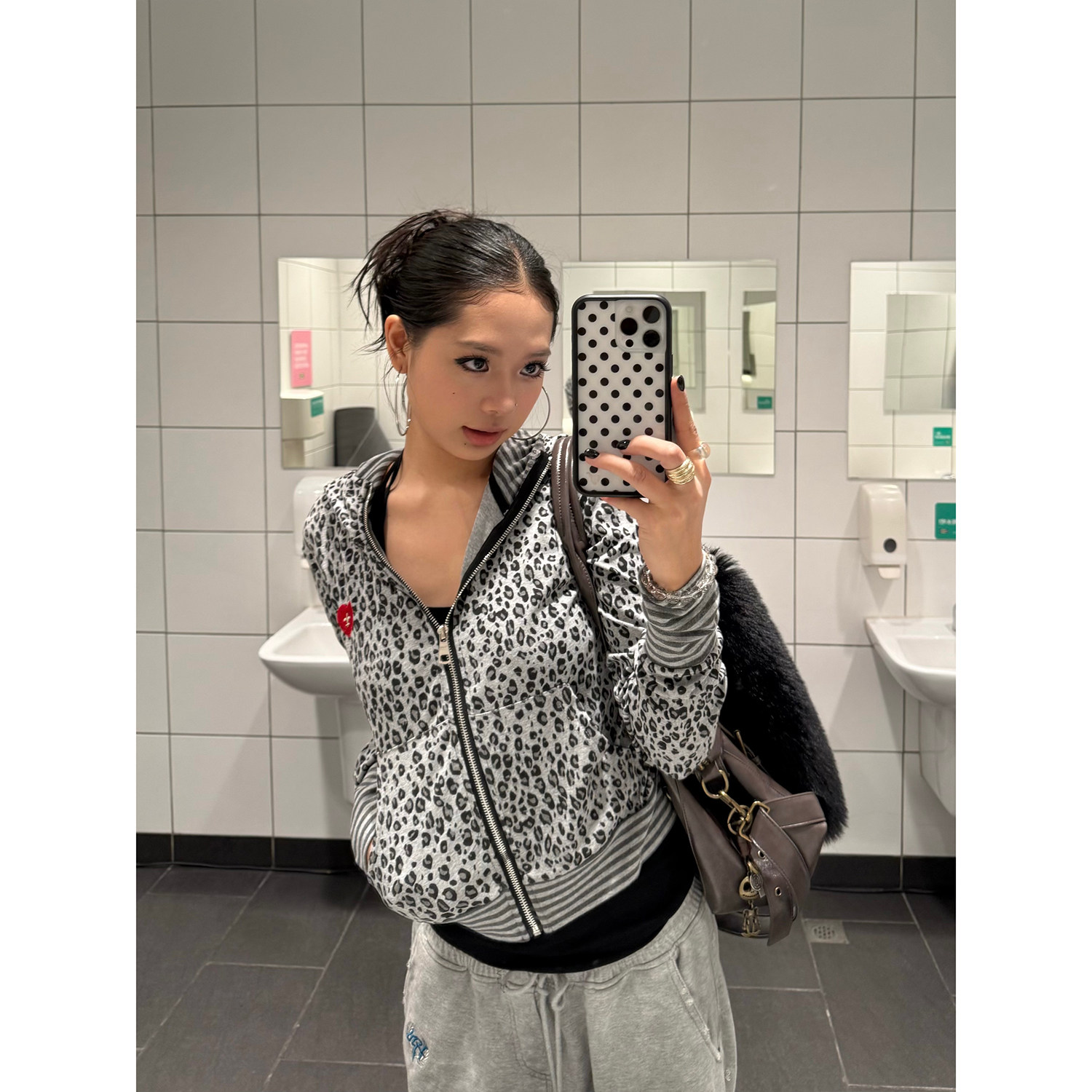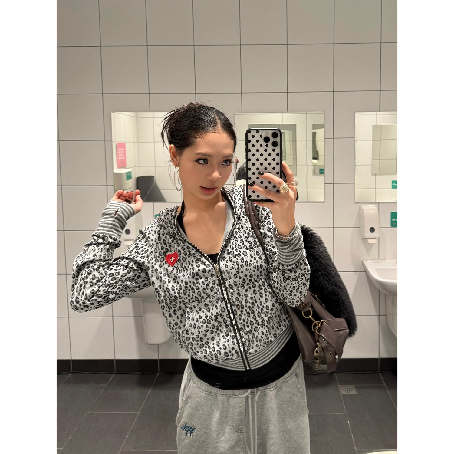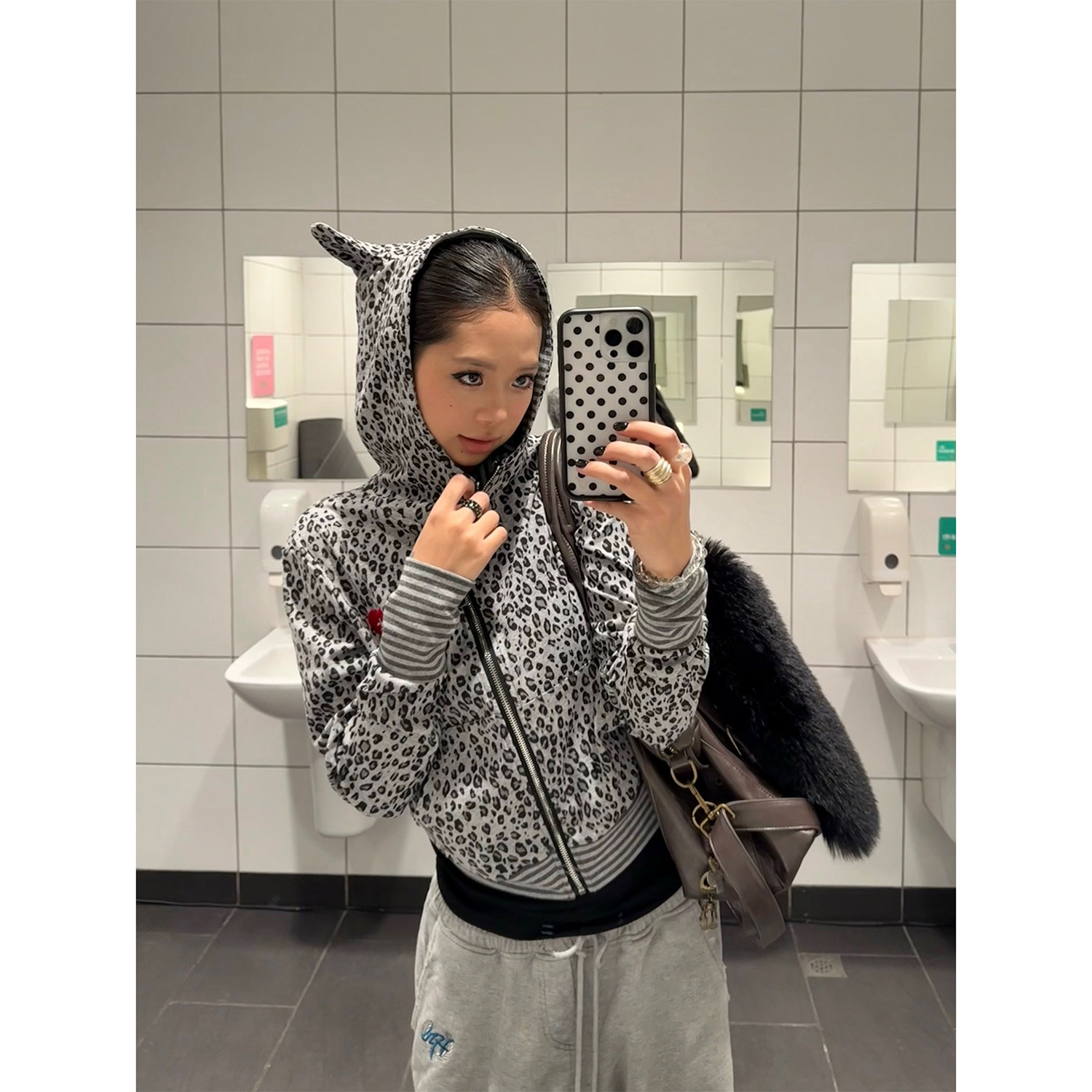 卫衣女设计感修身 复古爱心刺绣豹纹恶魔角连帽开衫 外套 美式 F383