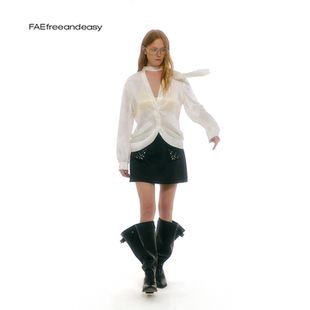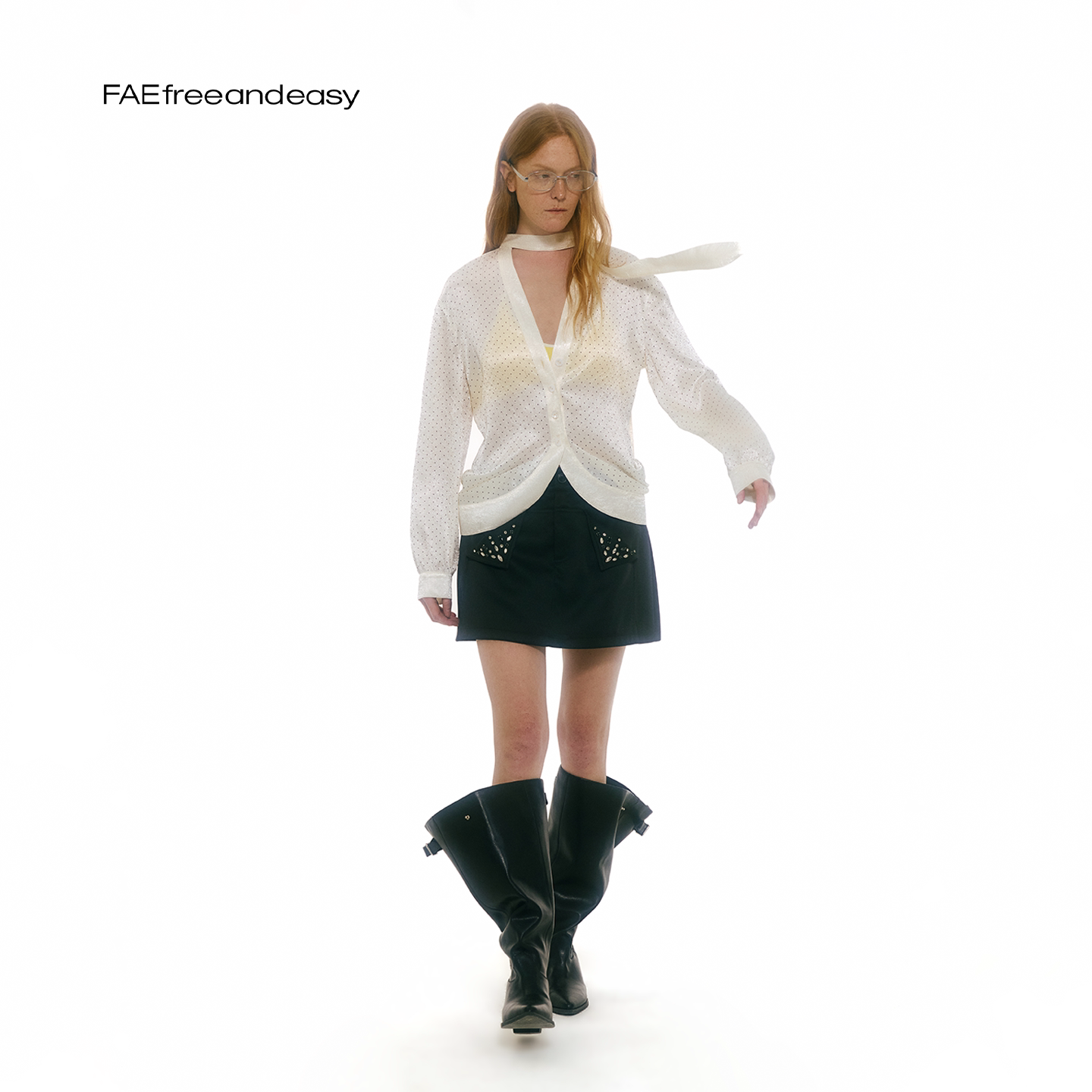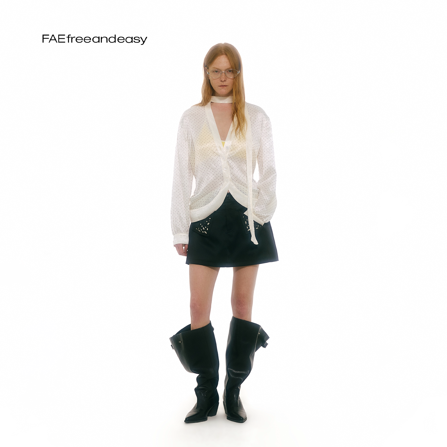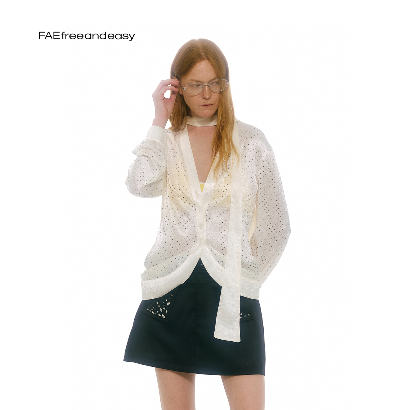 女轻薄缎面长袖 飘带v领堆量波点衬衫 BOSSlady 上衣春 FAE
