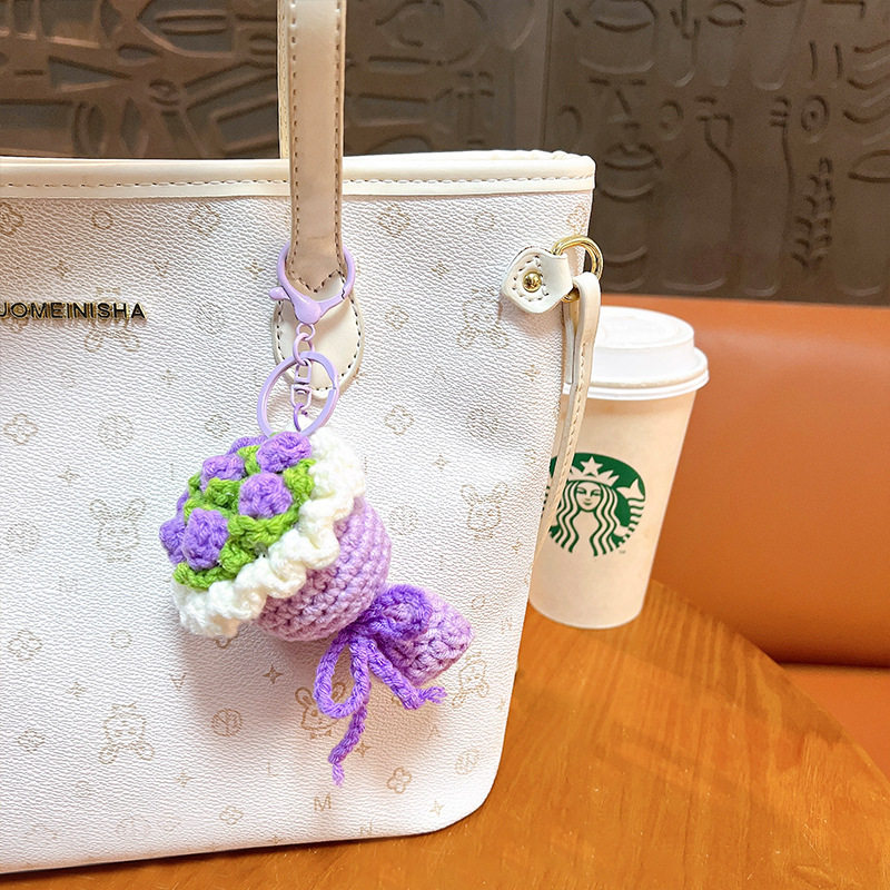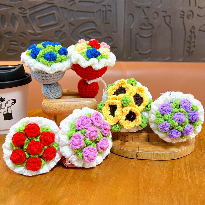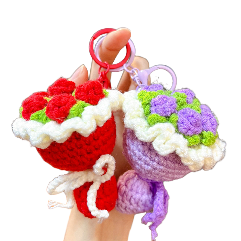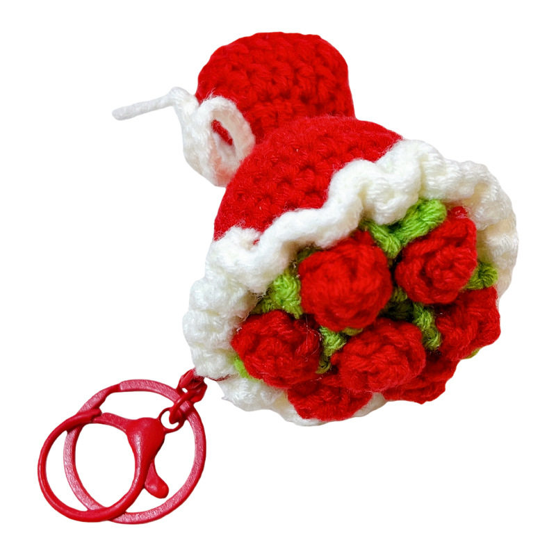 创意新款 毛线钩织手捧玫瑰花钥匙扣精致可爱包包配饰情侣礼品
