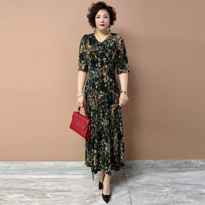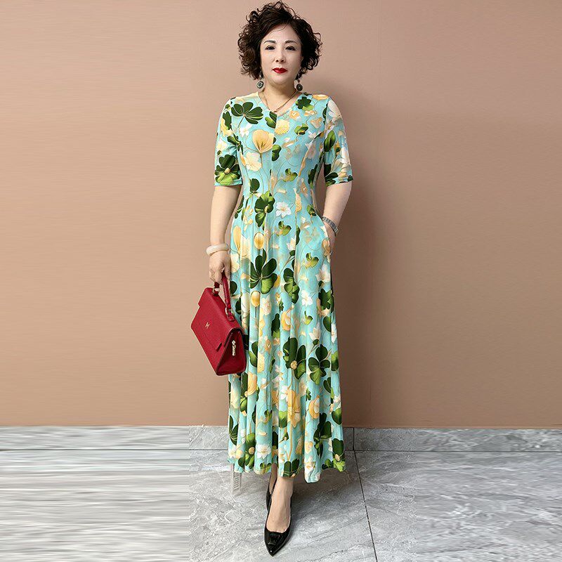 时尚 夏季 连衣裙弹力大码 长款 减龄中年妈妈遮肉显瘦十片大摆裙 短袖