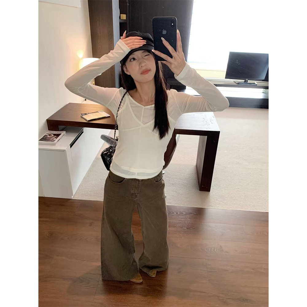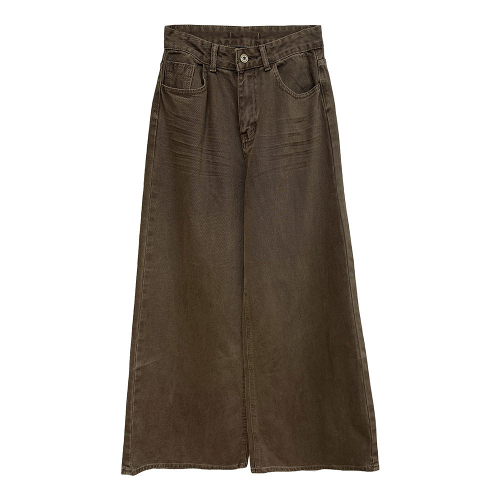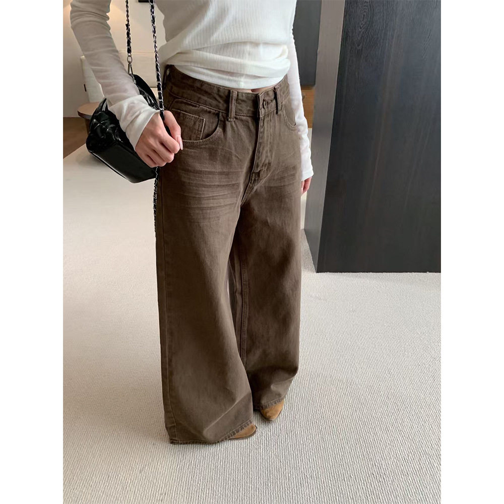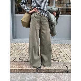 女美拉德色复合绒阔腿裤 新款 2025秋冬压树脂抓纹牛仔裤