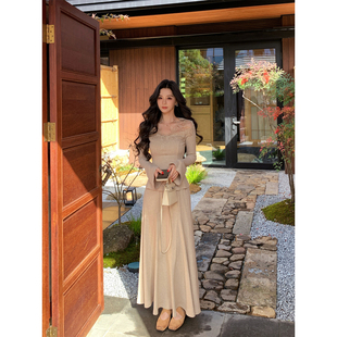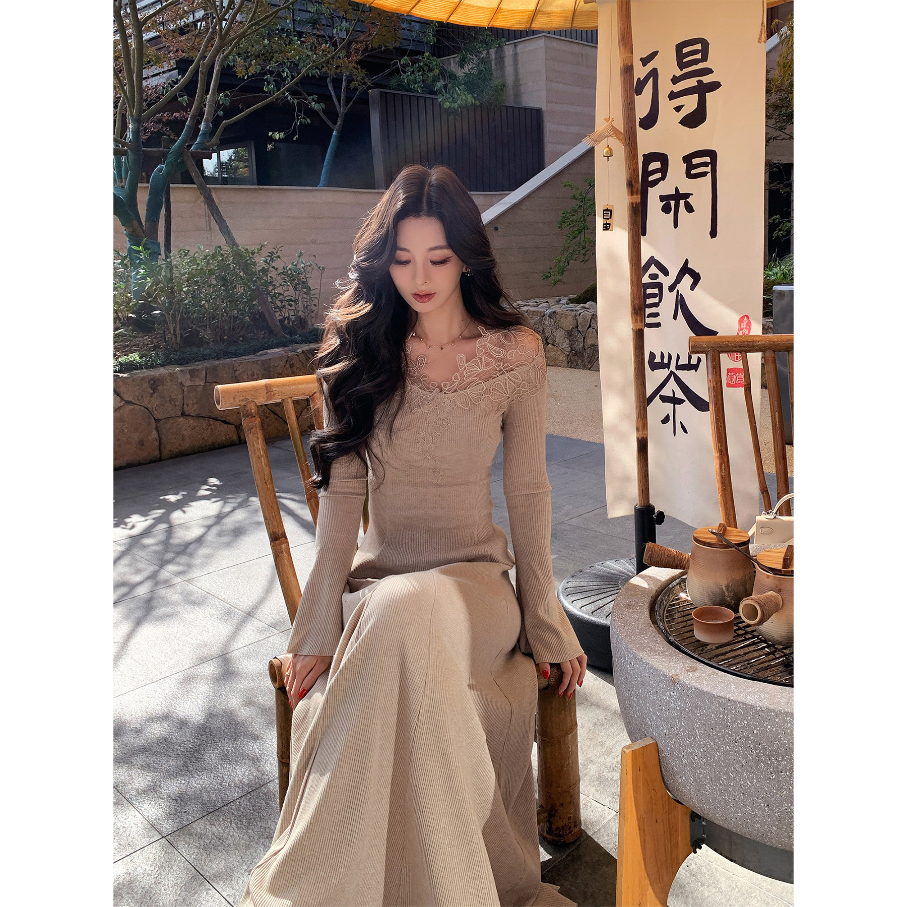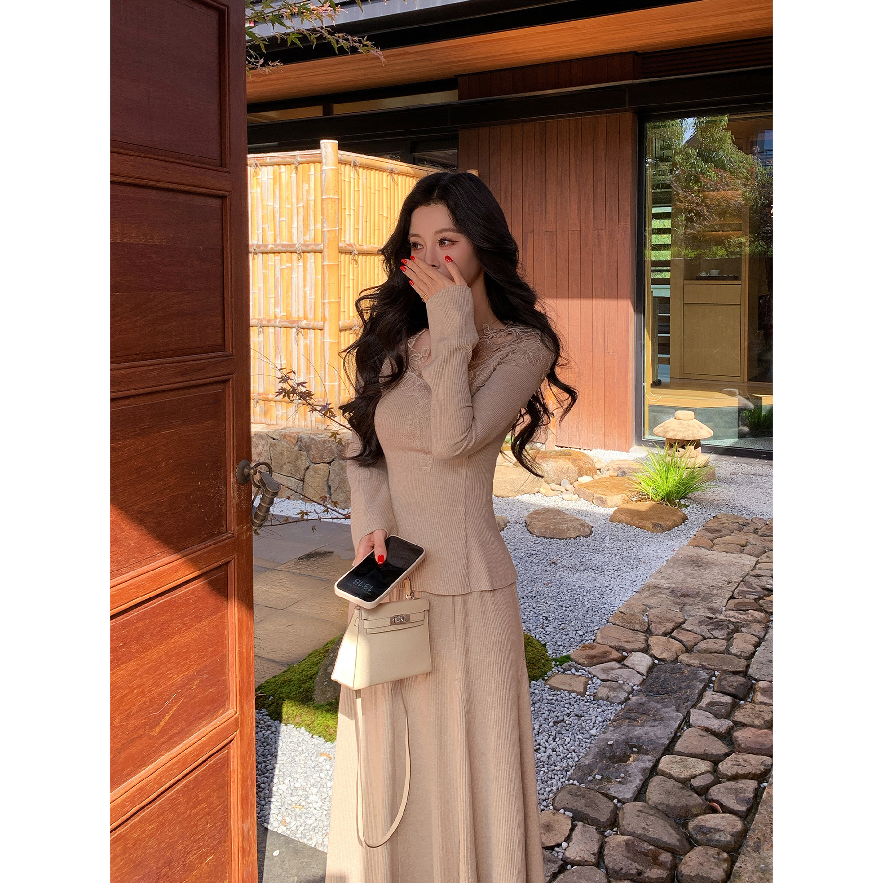 10AM徐琳「温婉月光」羽毛蕾丝燕麦色v领坑条针织伞裙套装