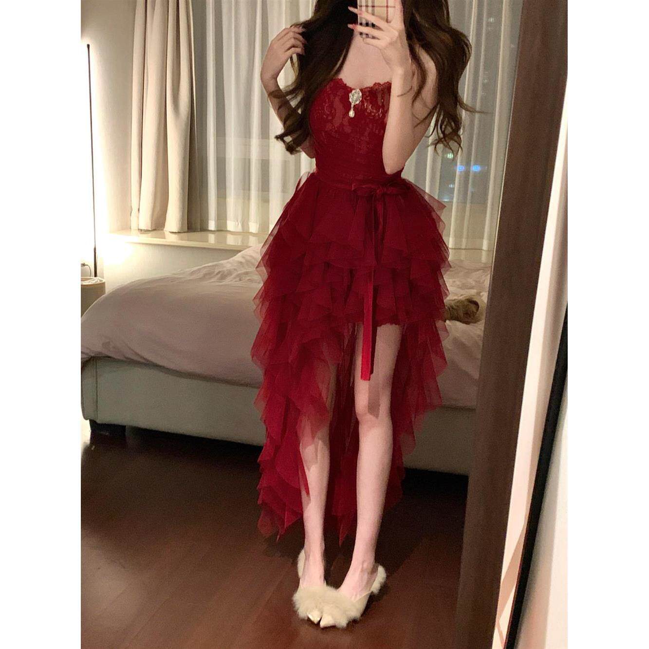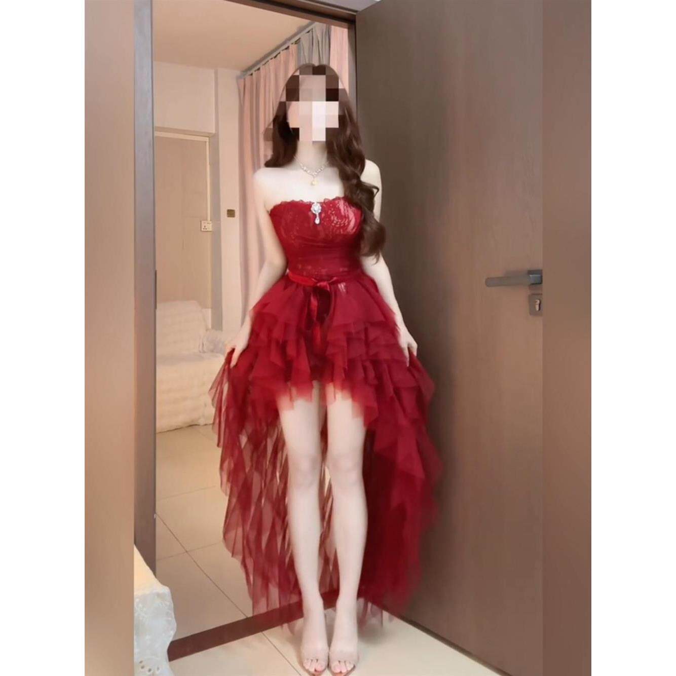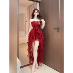 拖尾长裙 显瘦连衣裙 法式 纯欲名媛红色复古抹胸蕾丝包臀修身