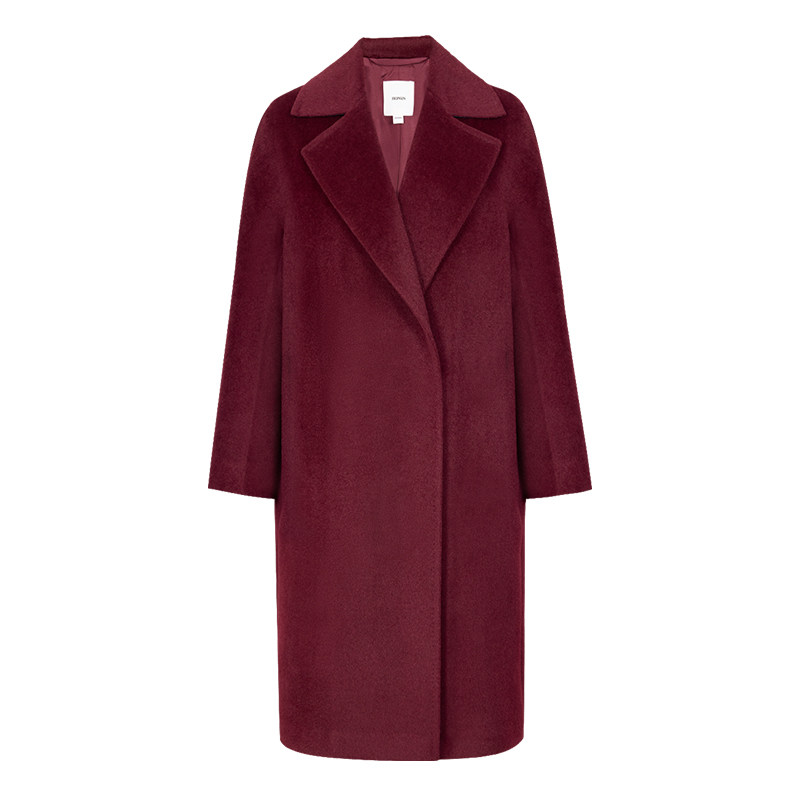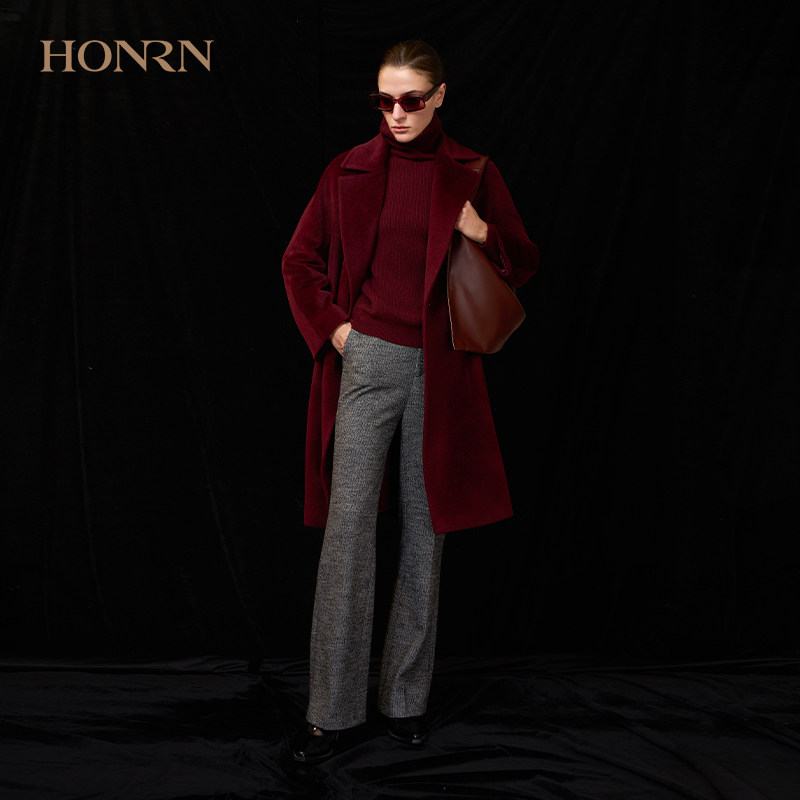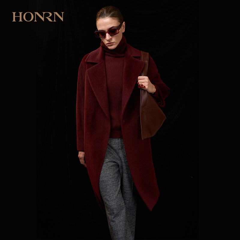 红人时尚 HONRN 酒红羊驼毛大衣外套女秋冬HJ55OD419 商场同款