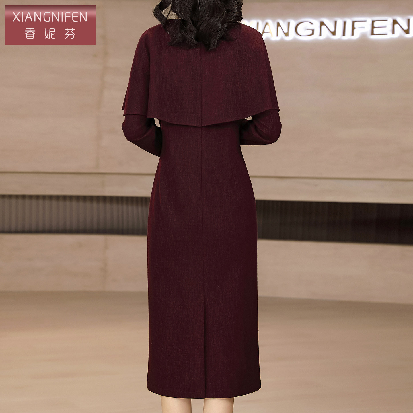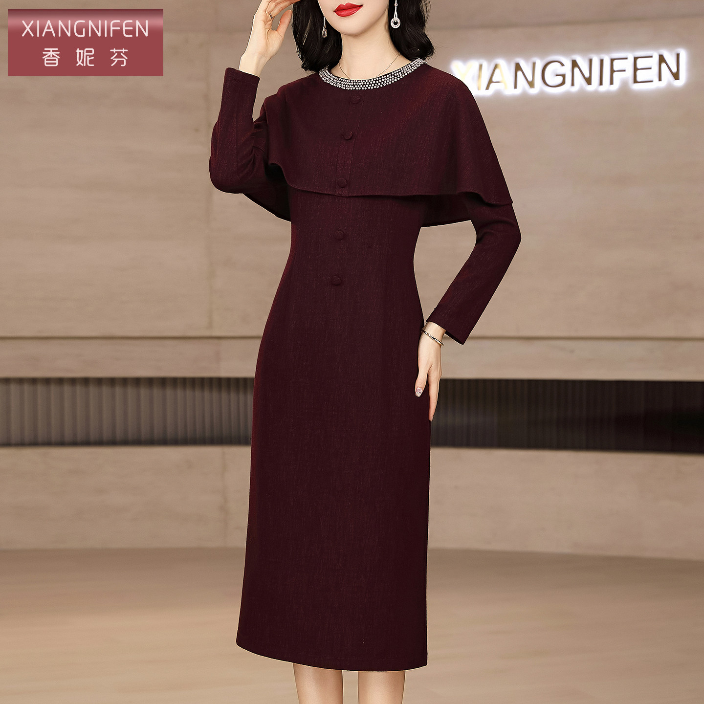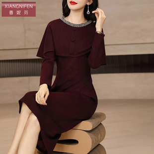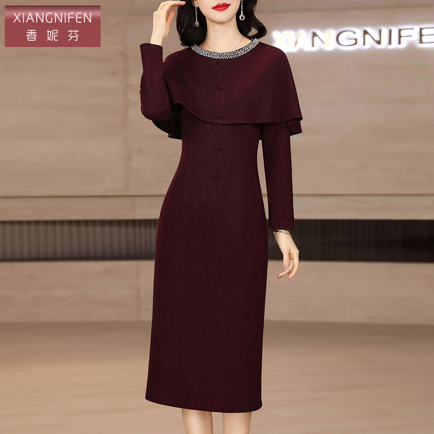 中长裙 修身 香妮芬设计感披肩圆领长袖 A字连衣裙气质妈妈秋冬新款