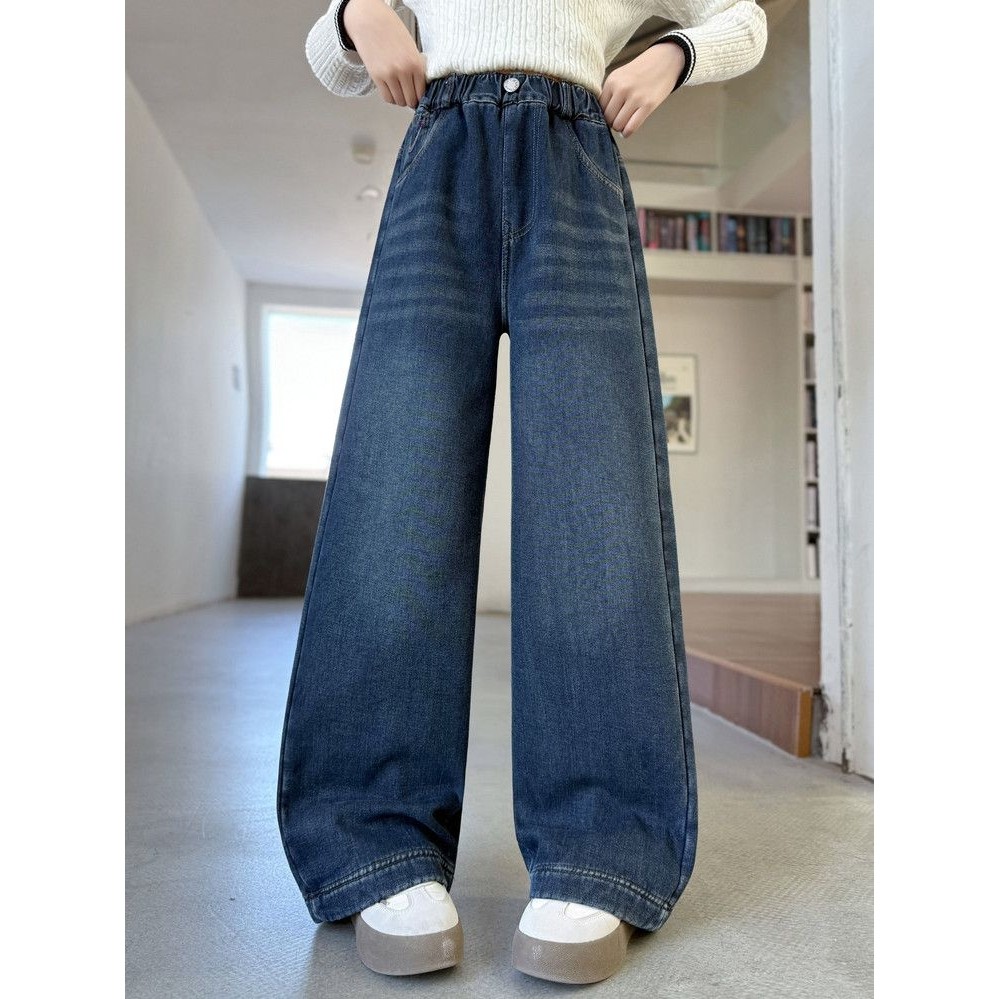 冬大童超好看酷飒净色阔腿儿童牛仔裤 女童加绒裤 子一体绒2025新款