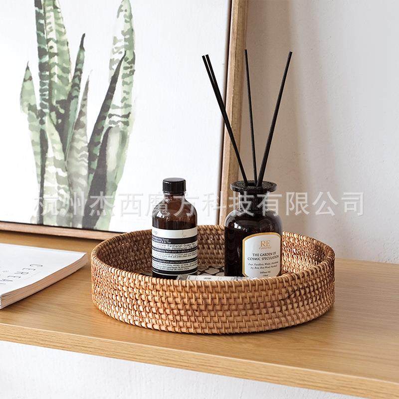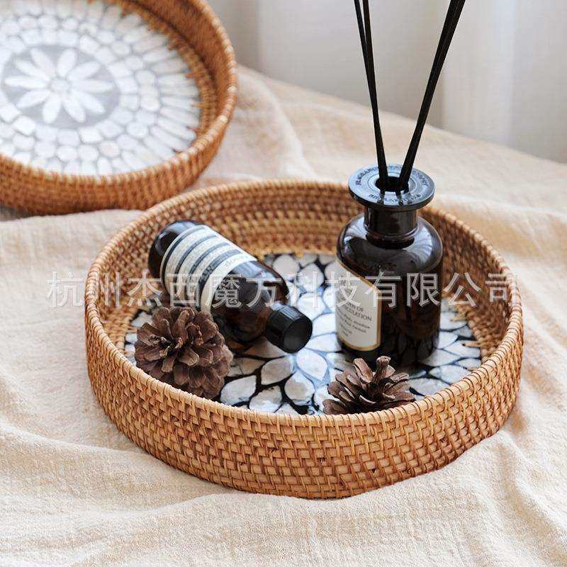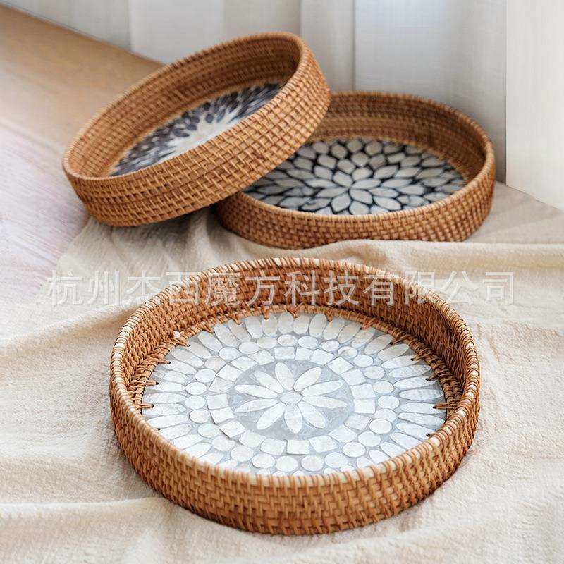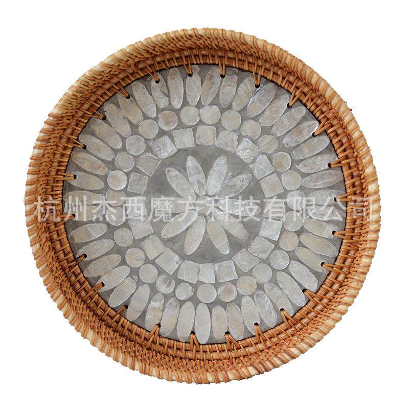 秋藤编织彩色贝壳贴片收纳盘装 饰置物圆盘杂物收纳筐桌面收纳复古