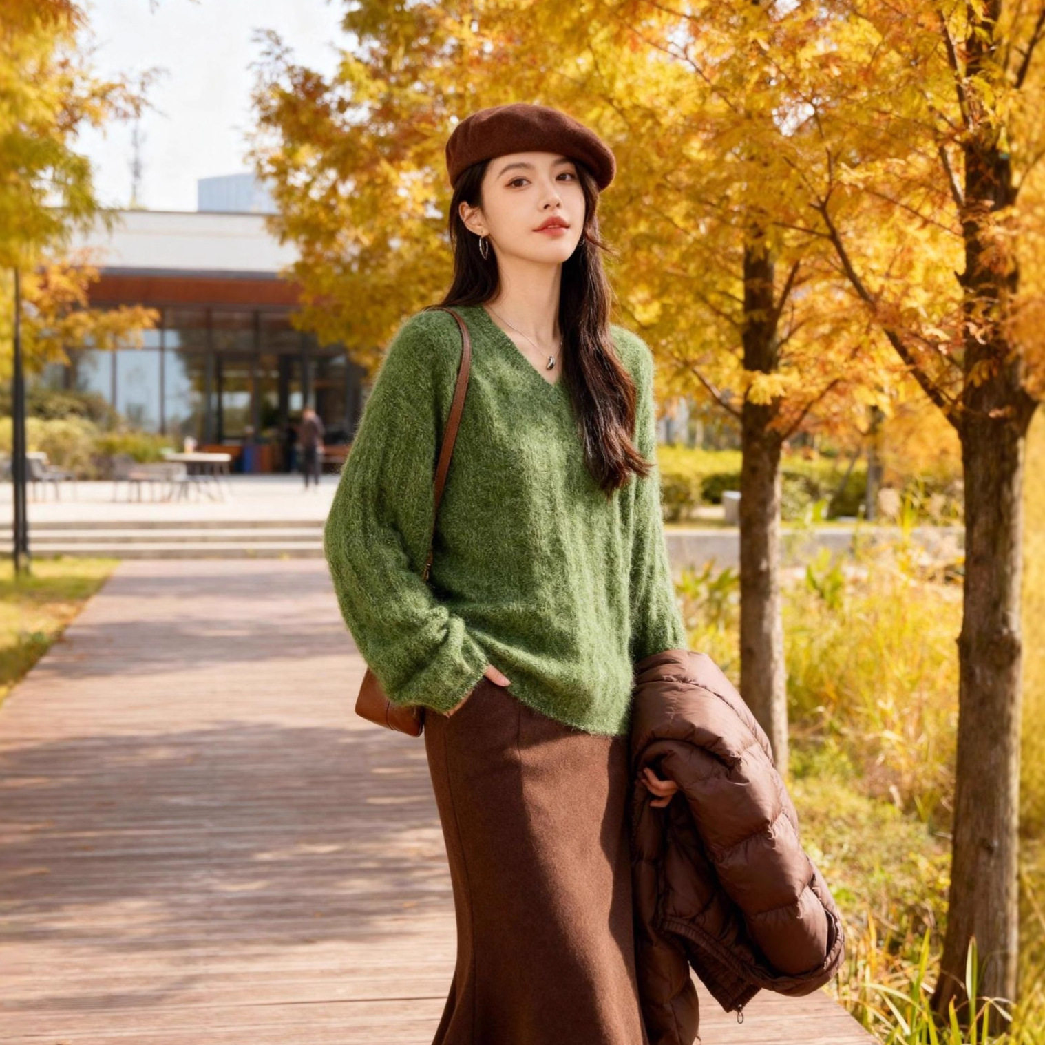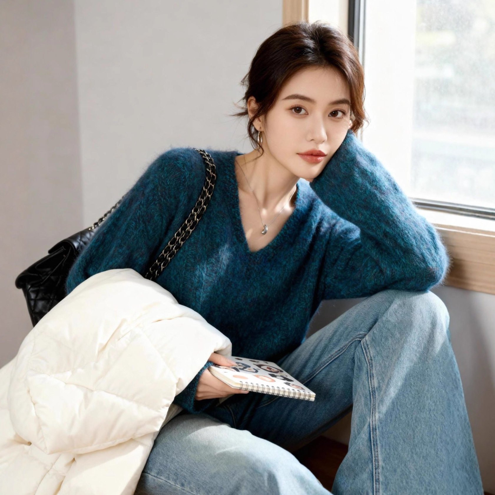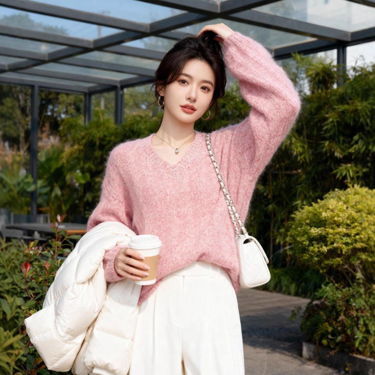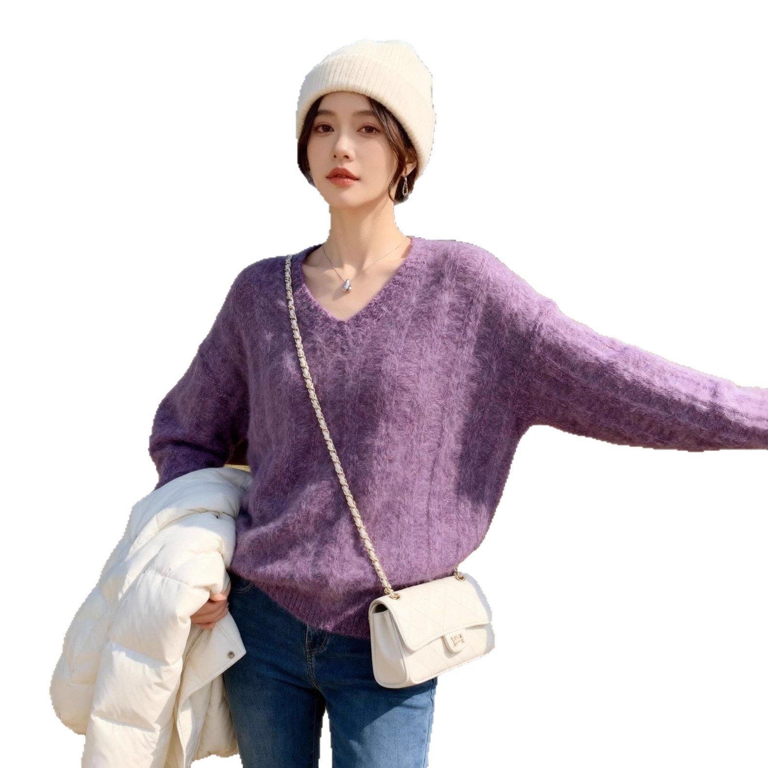 100羊毛羊绒花纱拉绒毛衣女秋冬350g加厚保暖宽松毛衣羊毛衫 女士