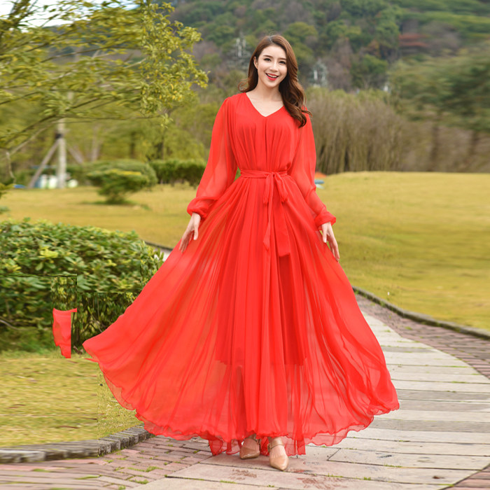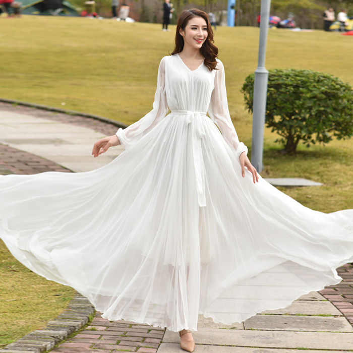 连衣裙雪纺超长长裙大摆大码 及踝沙滩裙 春夏裙子气质海边度假长款