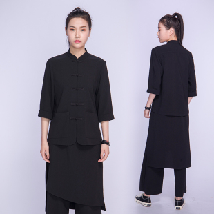 立领盘扣套装 弹力中式 男女黑色 餐厅火锅店服务员工作服套装 新中式