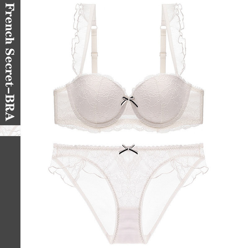 好奇蜜斯前扣内衣女聚拢小胸性感蕾丝薄文胸罩套装 美背纯欲夏法式