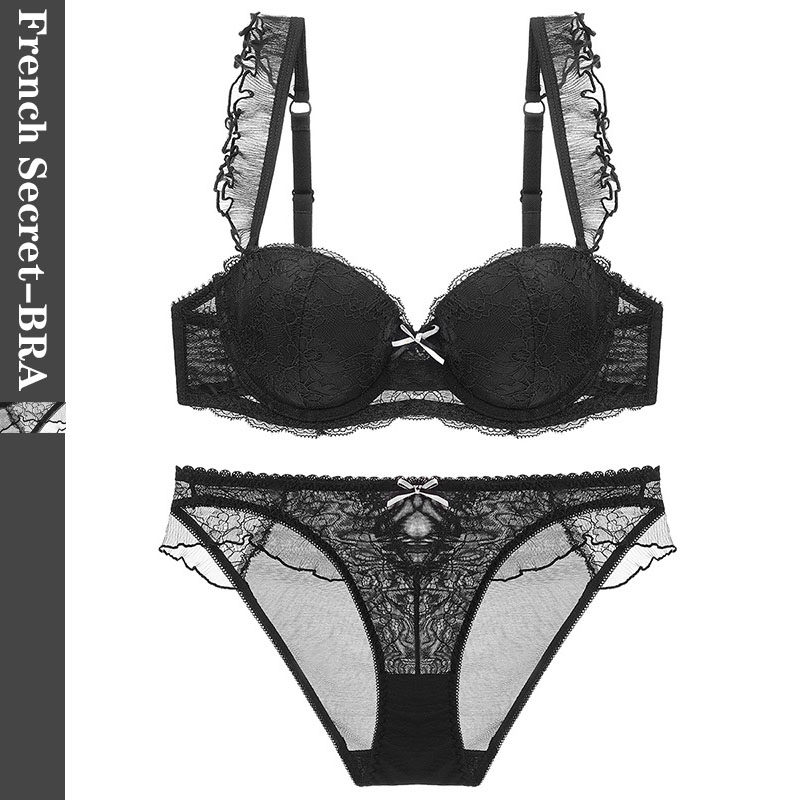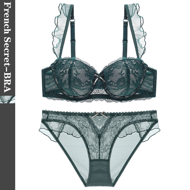 好奇蜜斯大胸显小胸内衣女性感夏薄防下垂法式 纯欲蕾丝文胸罩套装
