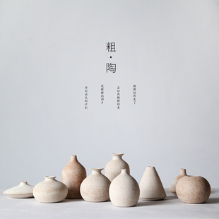 迷你水培陶瓷花瓶复古粗陶花器茶桌小花插禅意中式 饰花瓶 铜钱草装