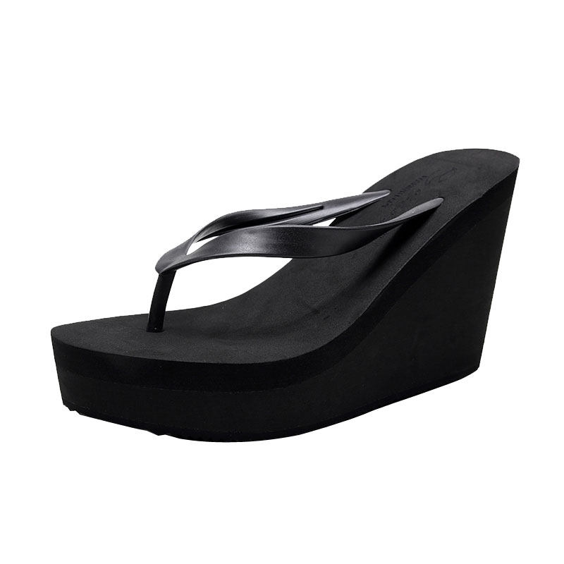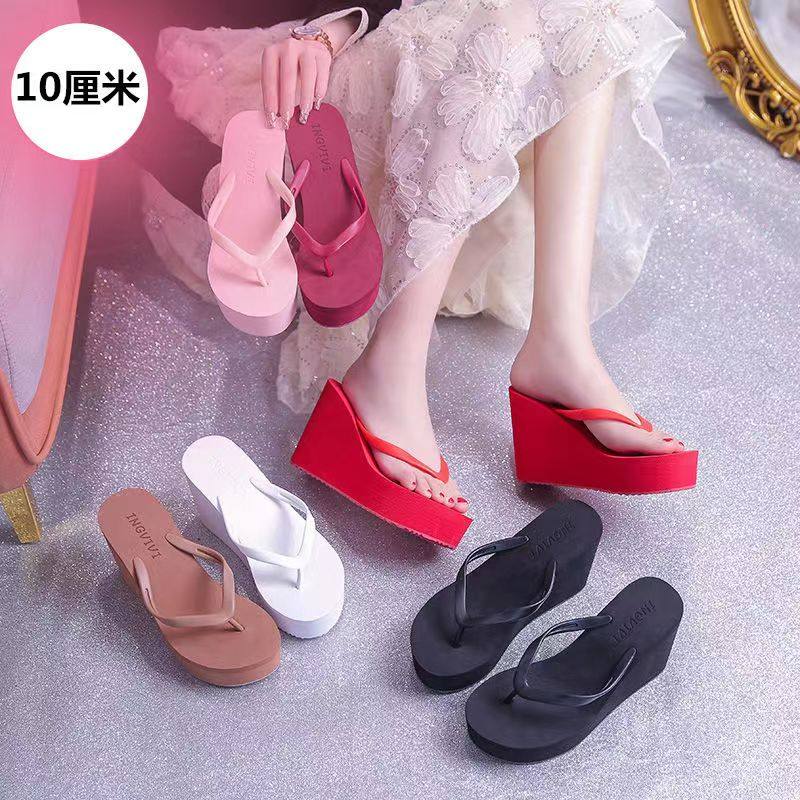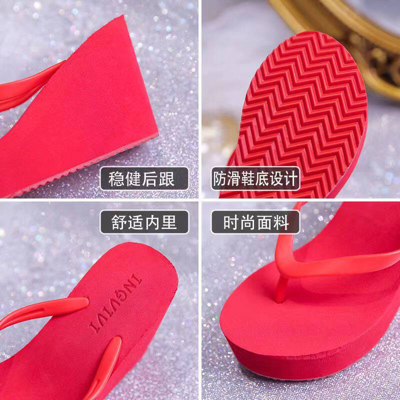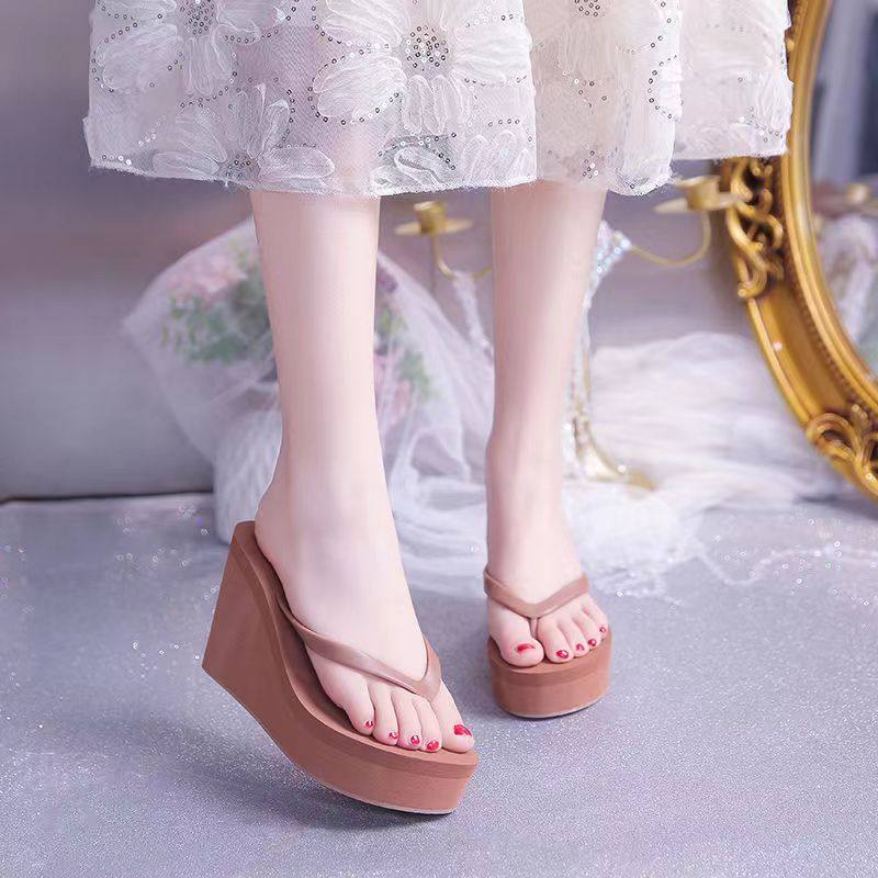 ins越南海边旅游外穿人字拖女时尚 百搭松糕卡其色坡跟增高8cm拖鞋
