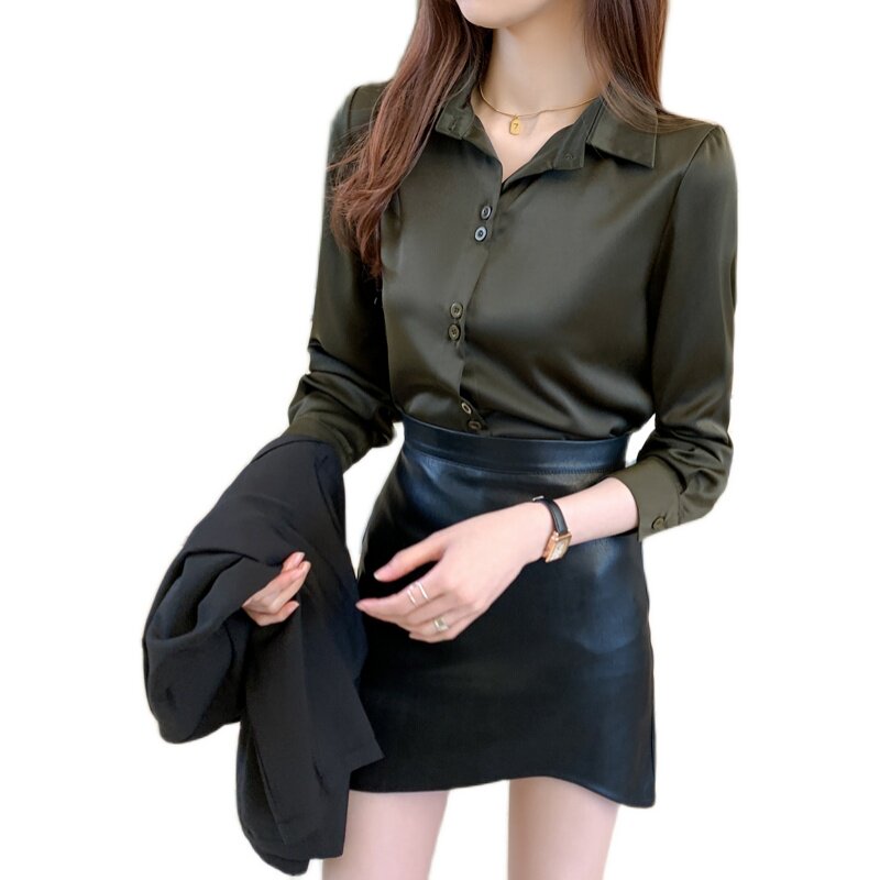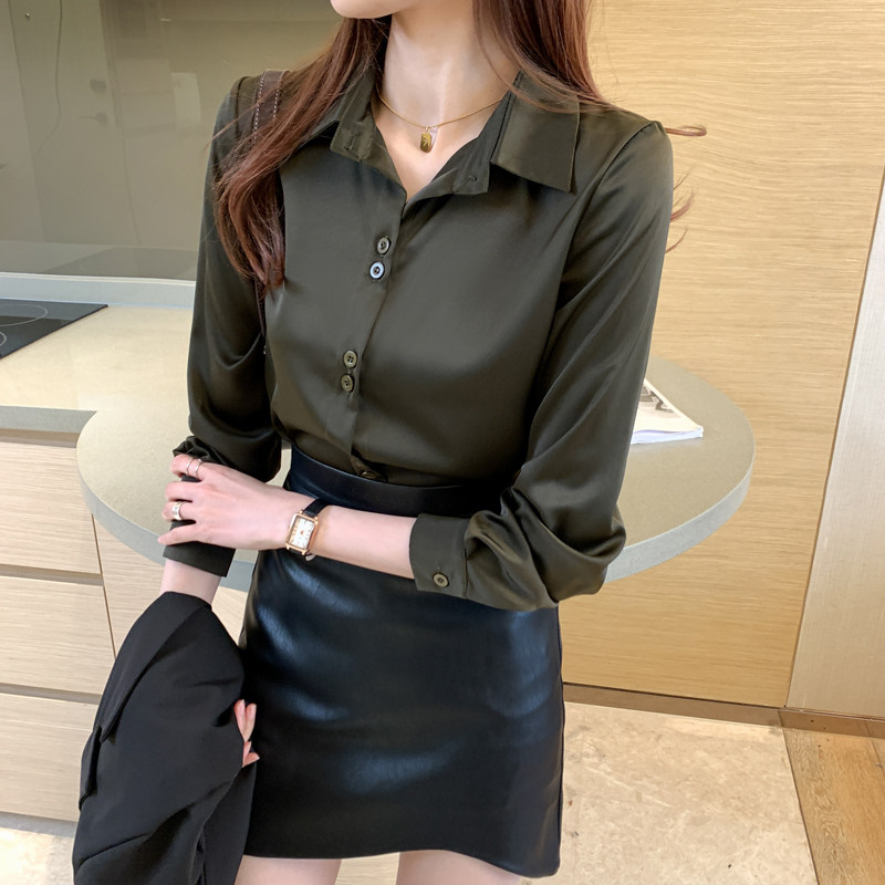 新款 春秋装 百搭洋气复古绿色上衣设计感小众衬衣潮 女长袖 缎面衬衫