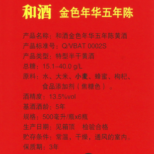6瓶装 和酒 黄酒整箱500ml 金色年华五年陈5年 黄酒上海老酒