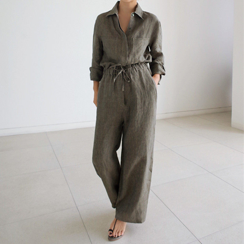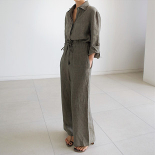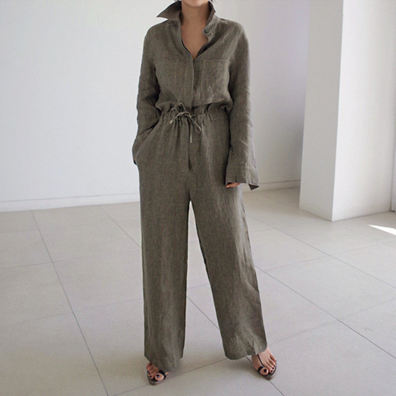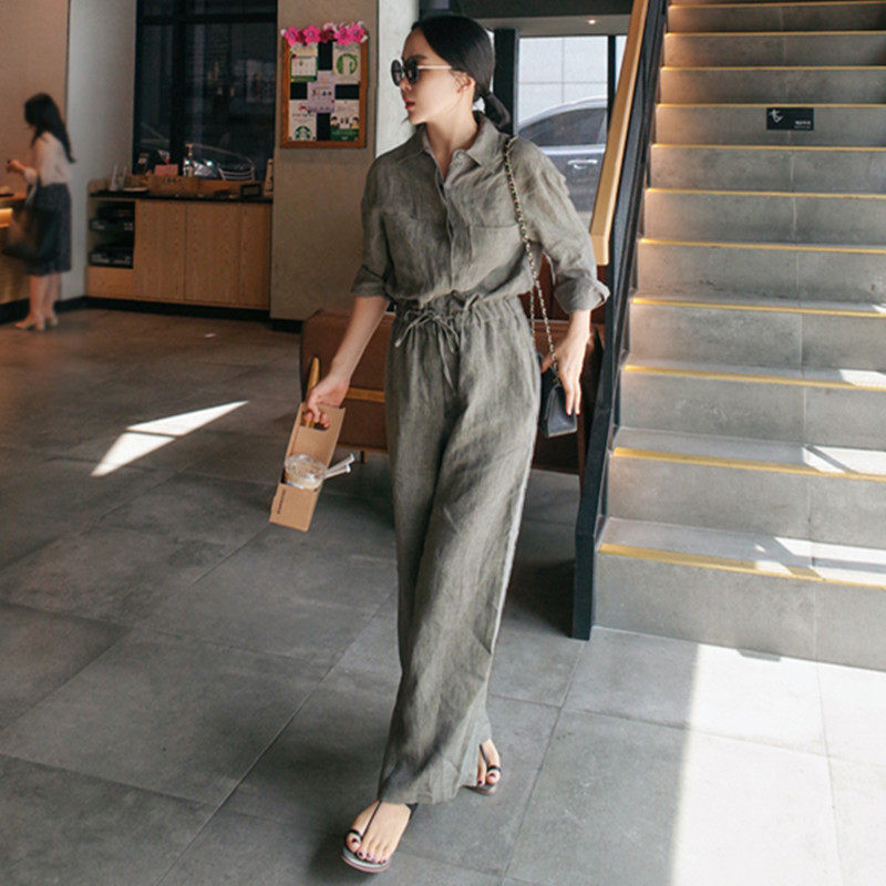 BF宽松亚麻套装 系带棉麻连体衣休闲学生九分裤 潮 裙大码 阔腿连体裤