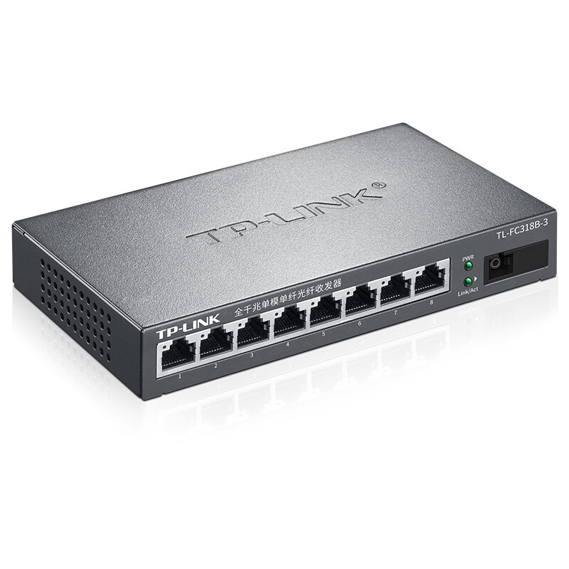 FC318B 8口千兆单模单纤光纤收发器光纤交换机1SC B端1光8电3KM传输光电信号转换器 普联TP 8GE LINK