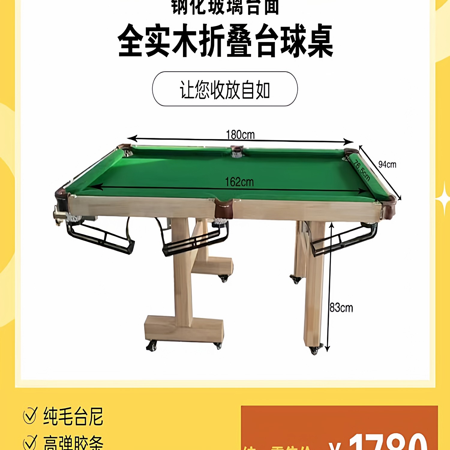 红杉林家用台球桌全实木折叠训练型标准英美式 案子钢化玻璃定制款