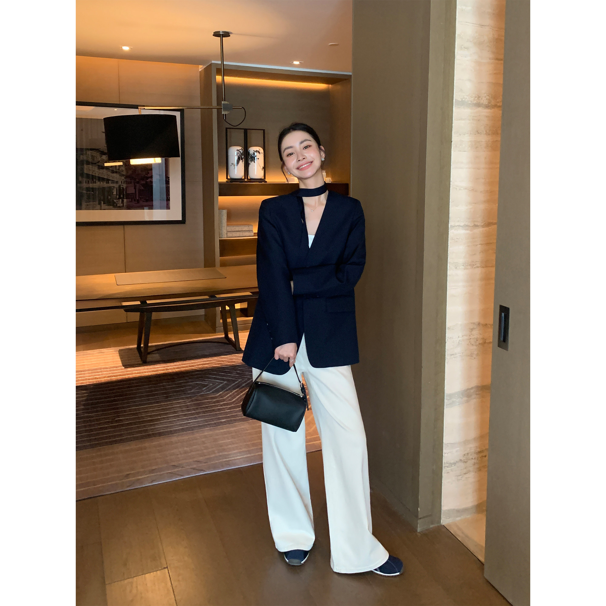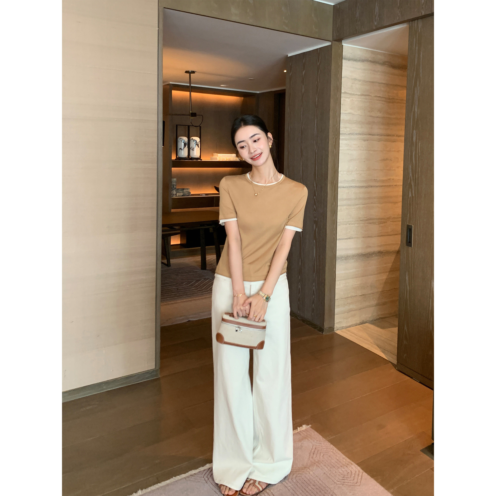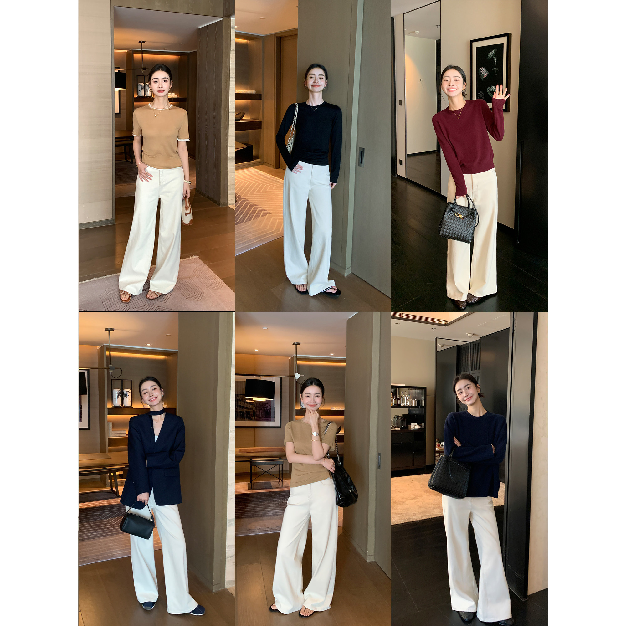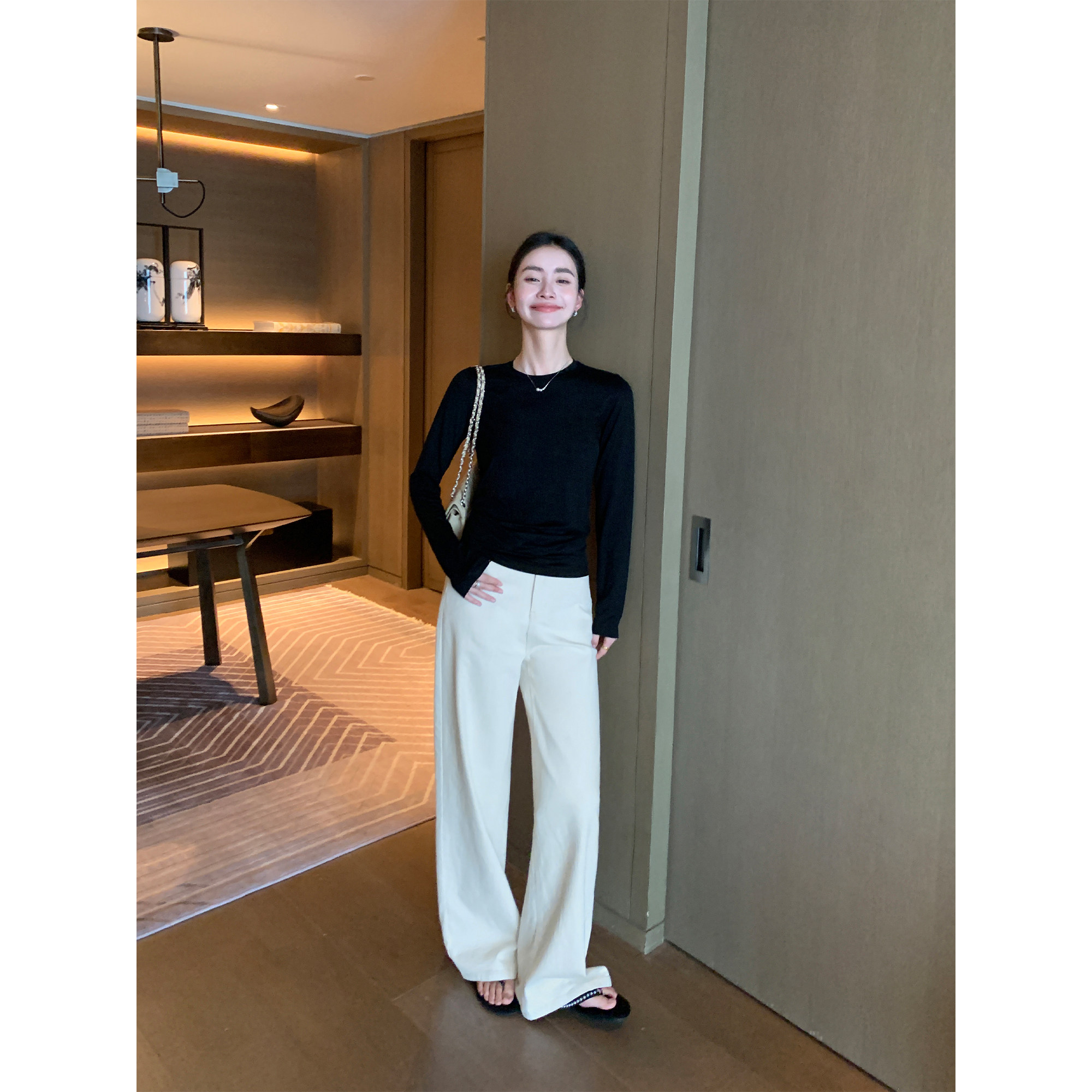 女春秋宽松直筒显瘦垂感阔腿裤 洗水米白色高腰牛仔裤 Lin Maven