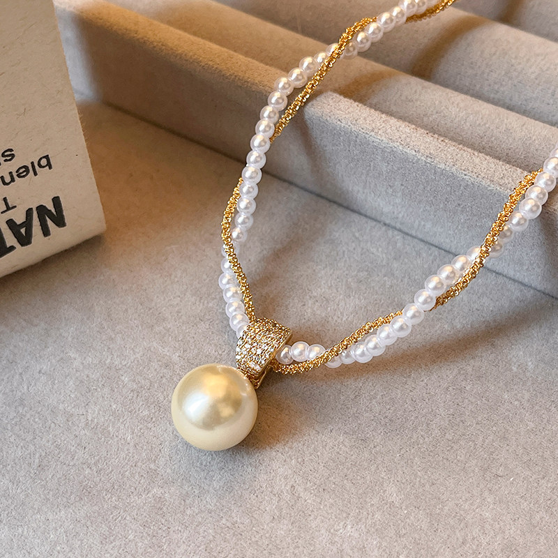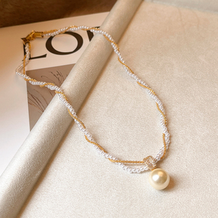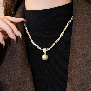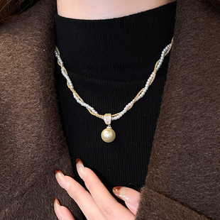 项链高级感简约休闲叠戴毛衣链 小众设计金银撞色珍珠吊坠长款