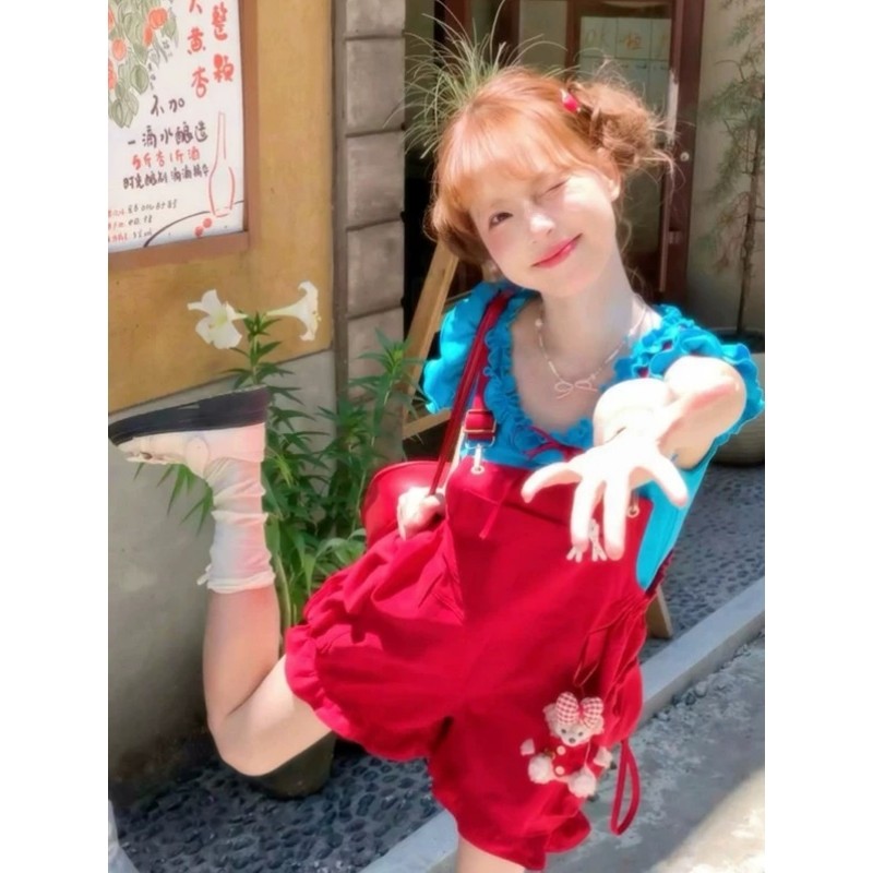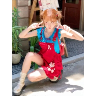度假套装 多巴胺穿搭夏季 上衣红色宽松背带裤 巨好看可爱小飞袖 新款