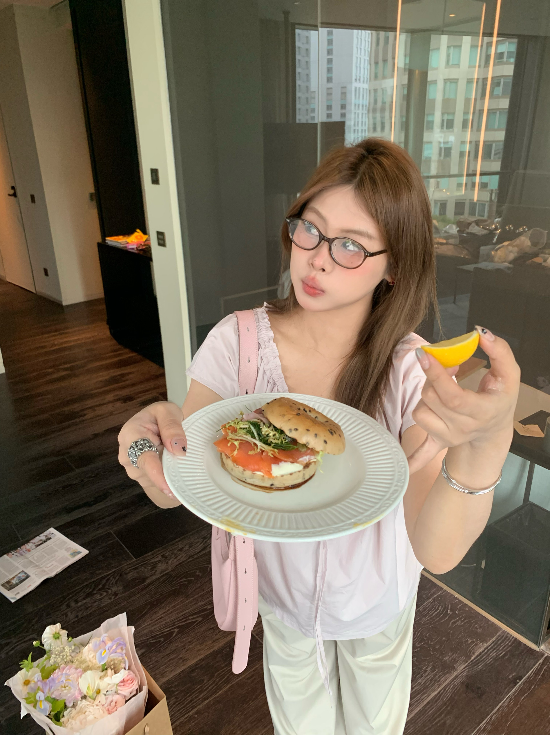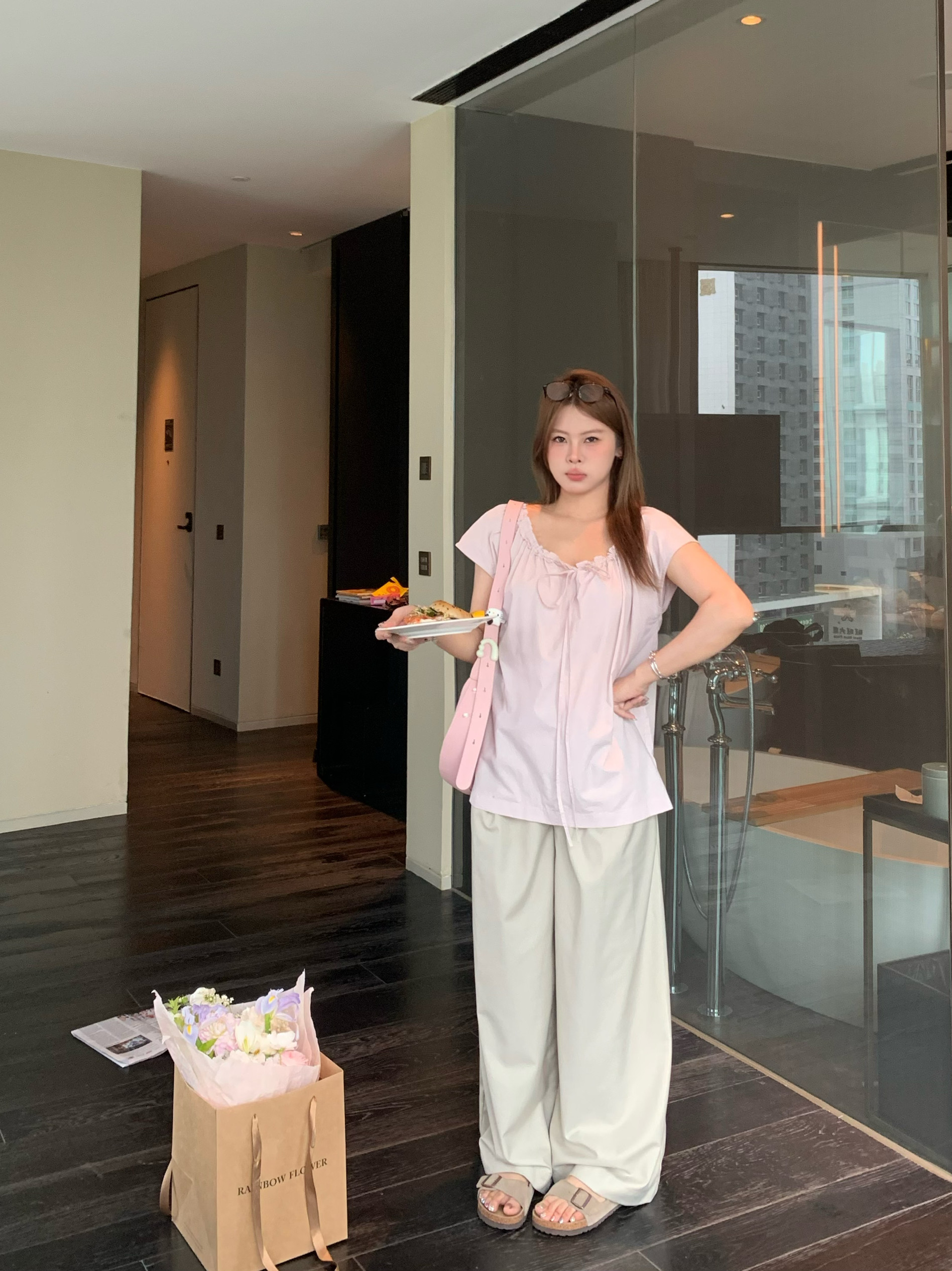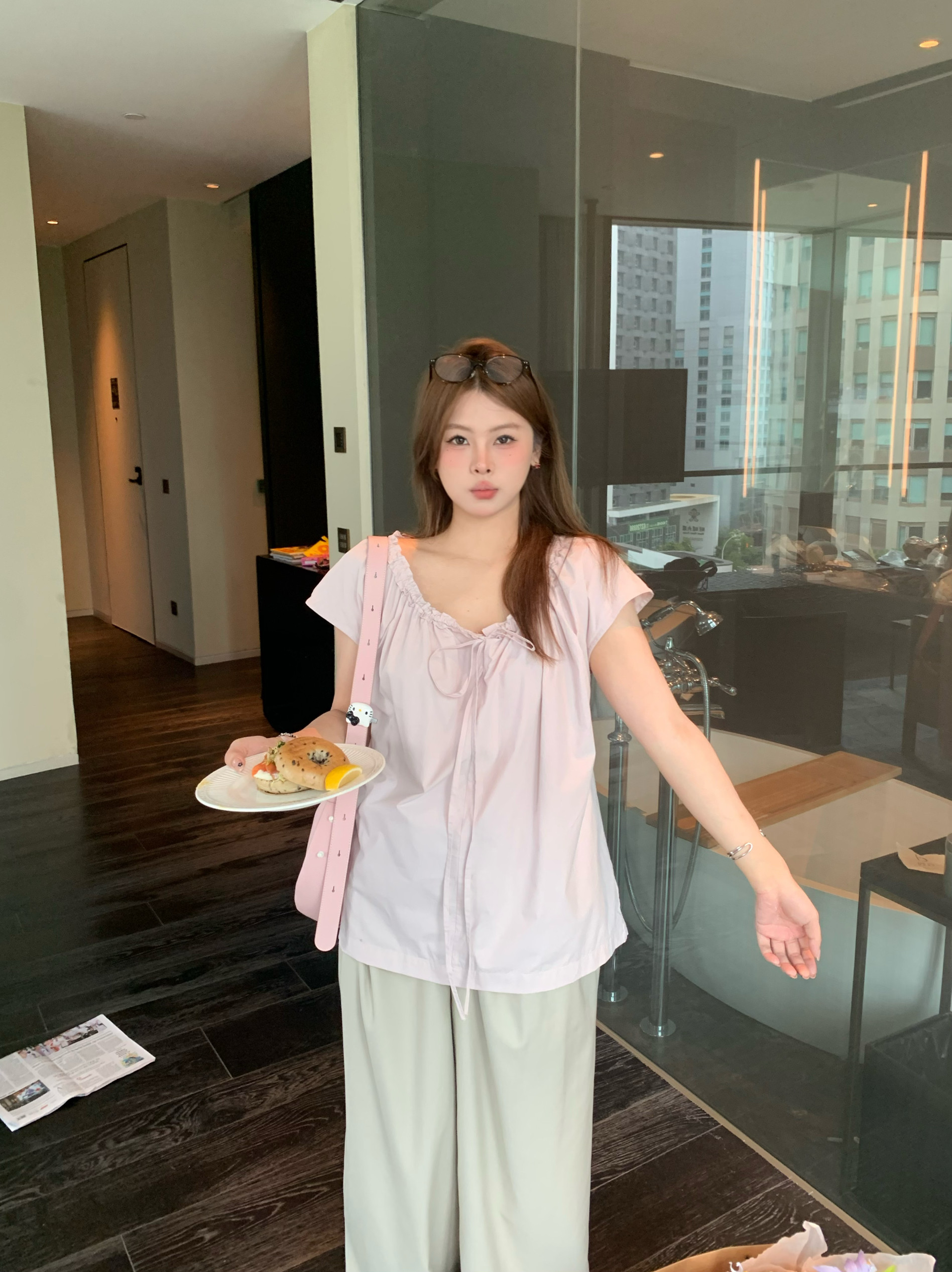 甜美设计感短袖 韩系粉色抽绳宽松小衫 上衣 半枝小樱 宅宅athome