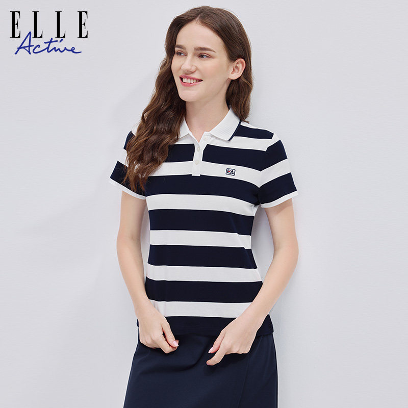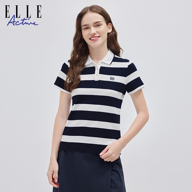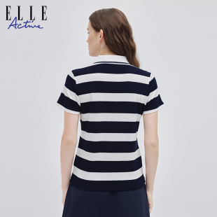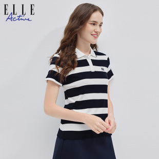 t恤新款 ELLE 短袖 polo衫 翻领条纹纯棉休闲舒适透气上衣 ACTIVE女装