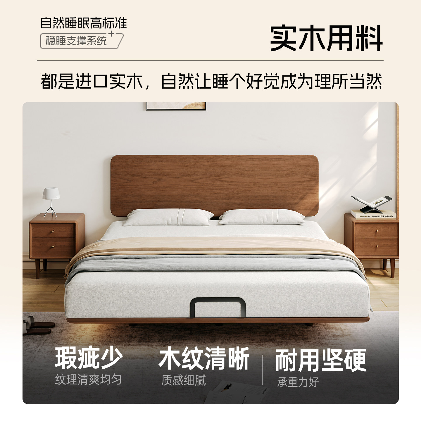 实木床现代简约胡桃木主卧1.5米双人床1.8米主卧轻奢婚房双人床