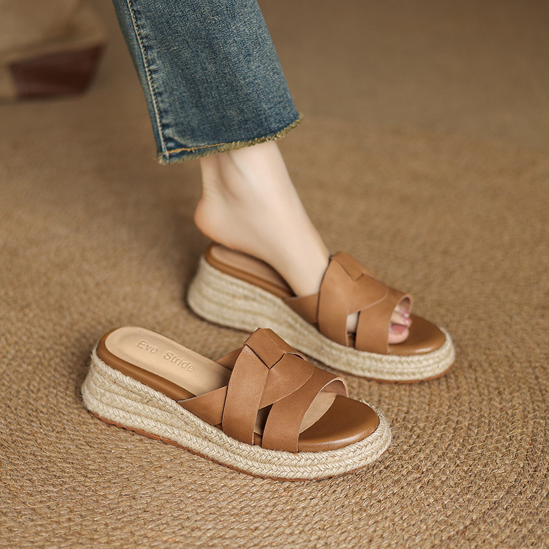 女夏季 鞋 新款 坡跟半拖大码 小个子增高鞋 百丽菲比真皮草编厚底凉鞋