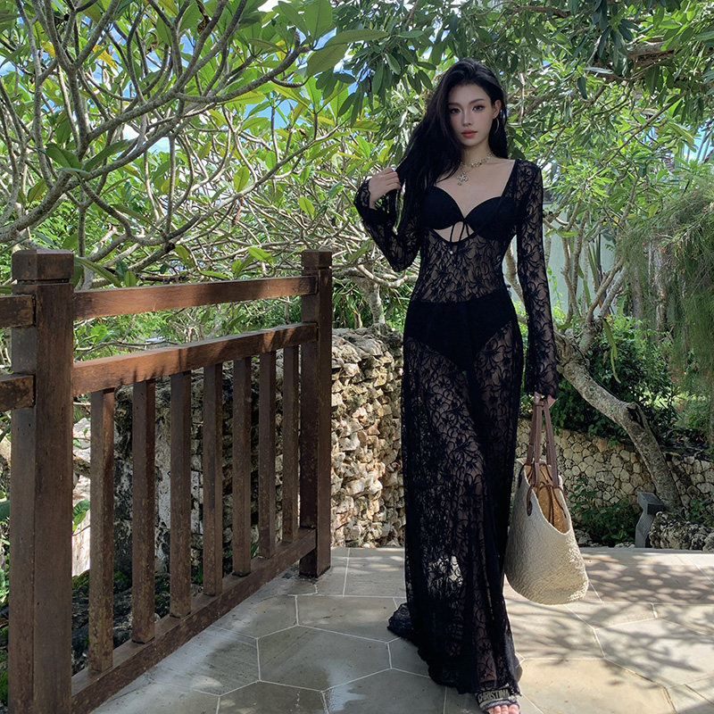2025夏钢托聚拢黑色蕾丝半透视比基尼长裙三件套海边度假绝美泳衣