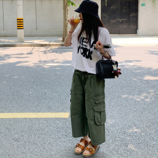 绿色纯棉暗纹百搭休闲长裤 7AM10PM个性 女 九分裤 潮 多口袋磨破工装
