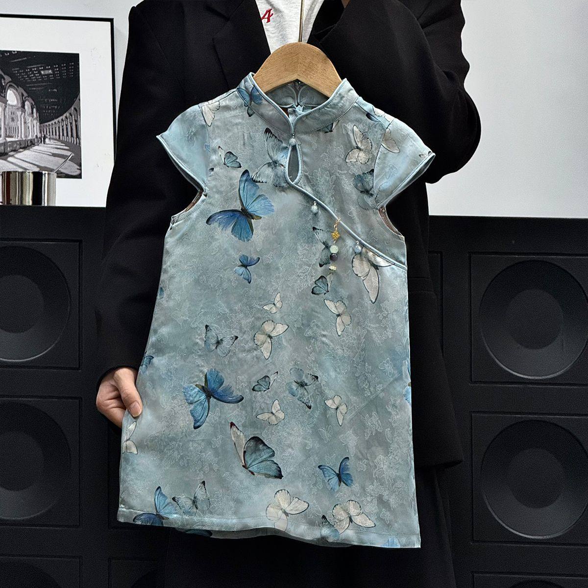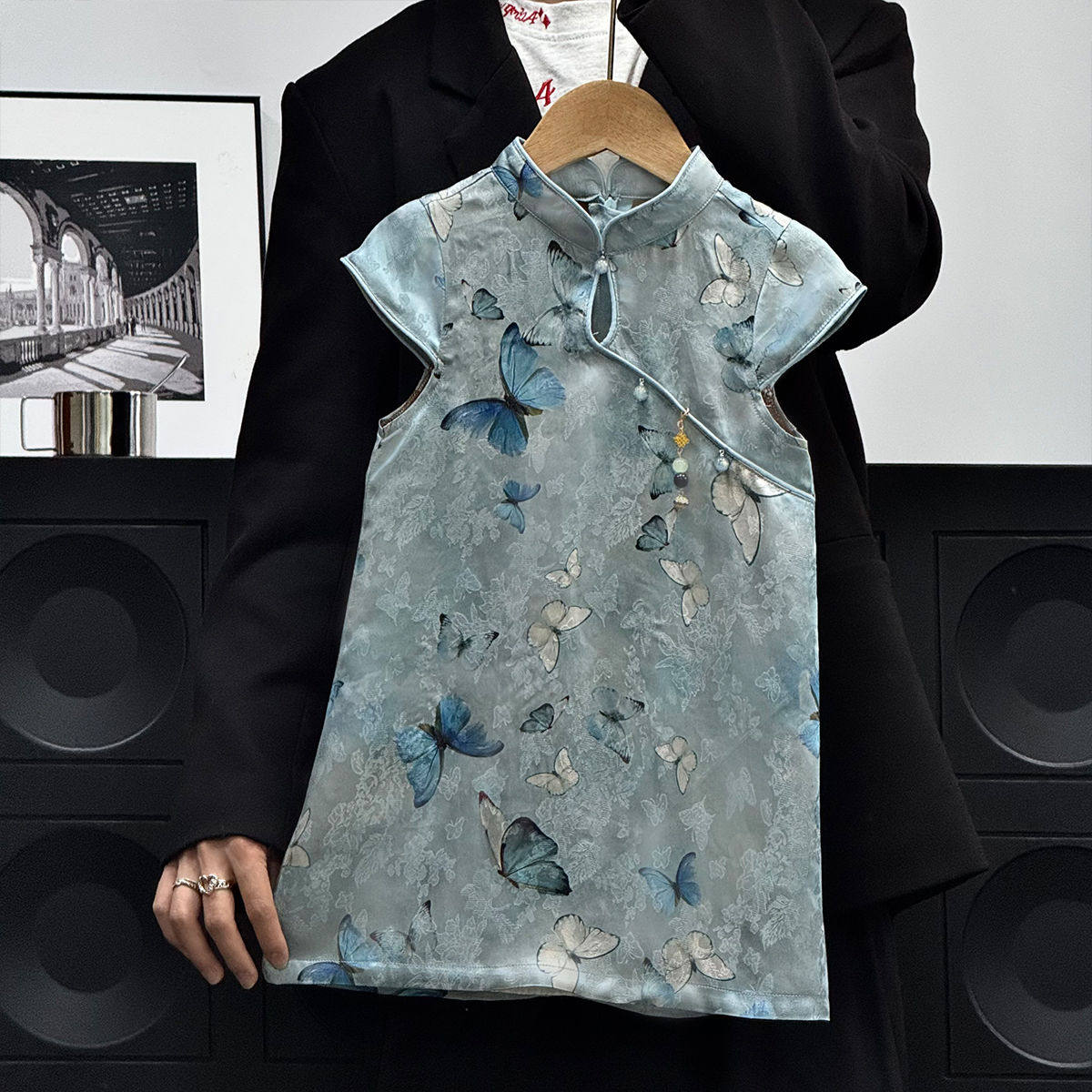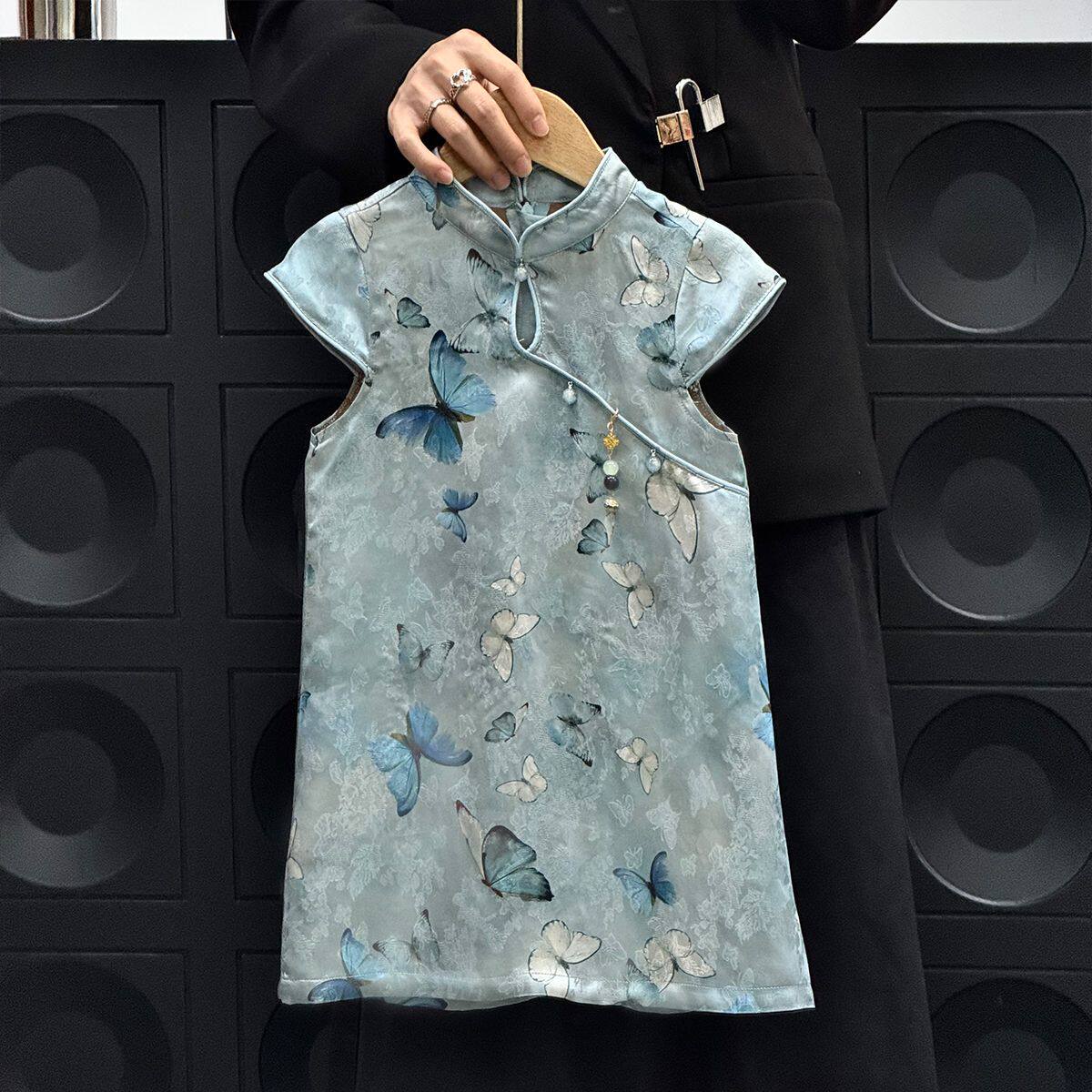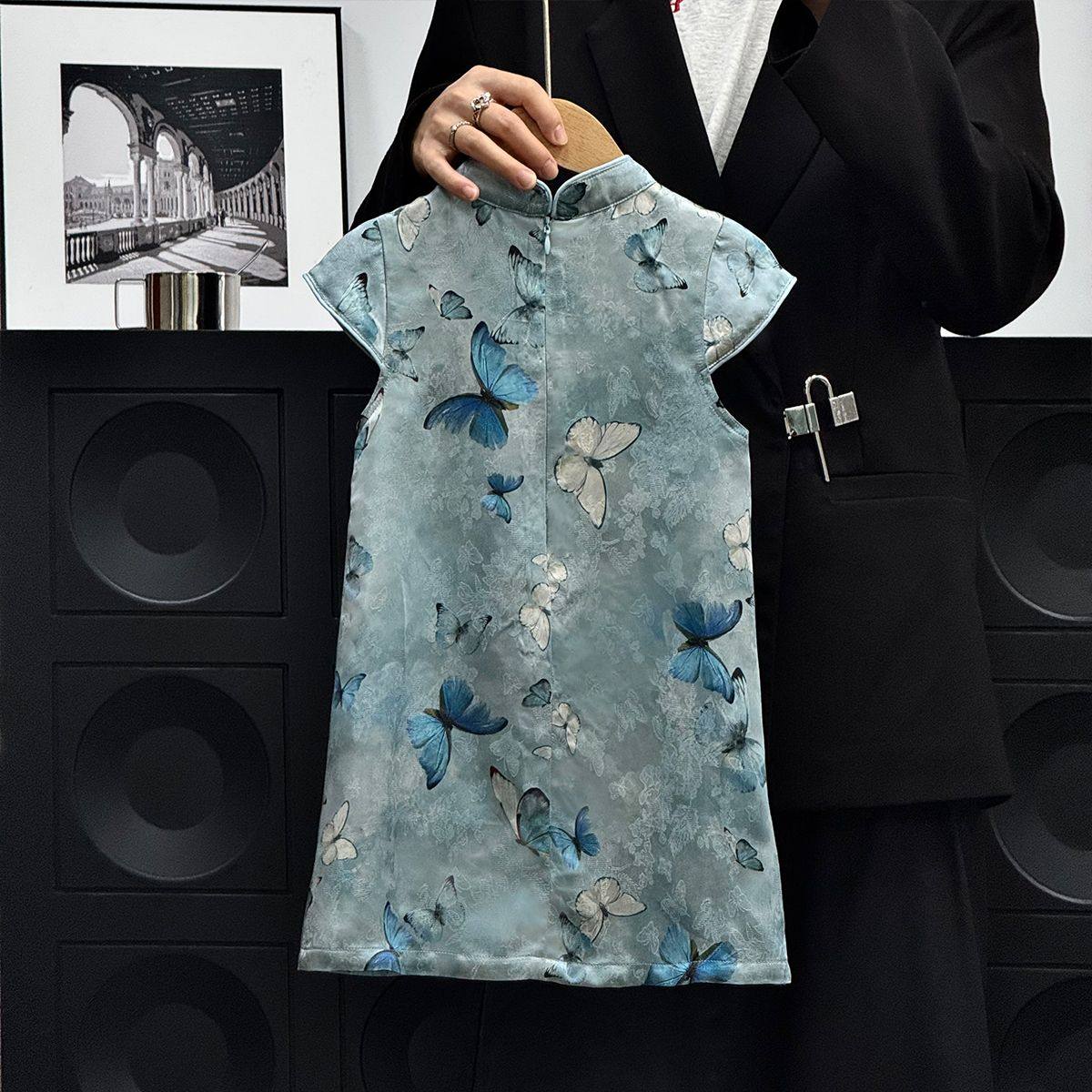 复古日常提花老旗袍 全开襟花盘扣长款 蓝蝶梦 八分水袖 茉茉秋冬新