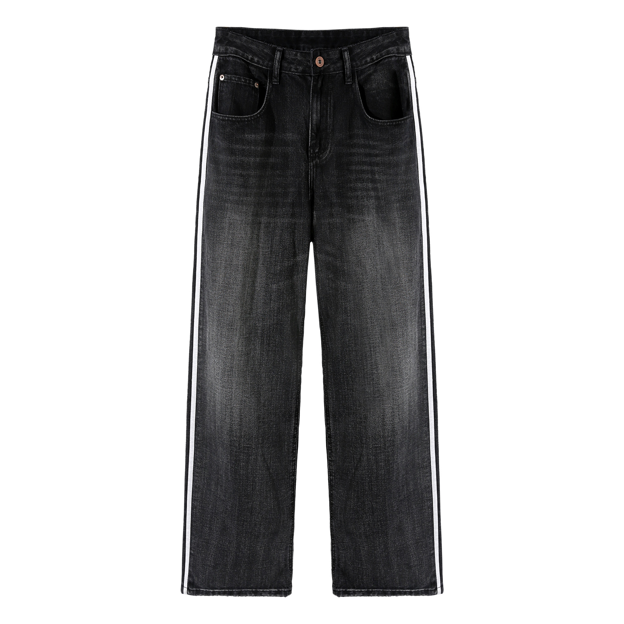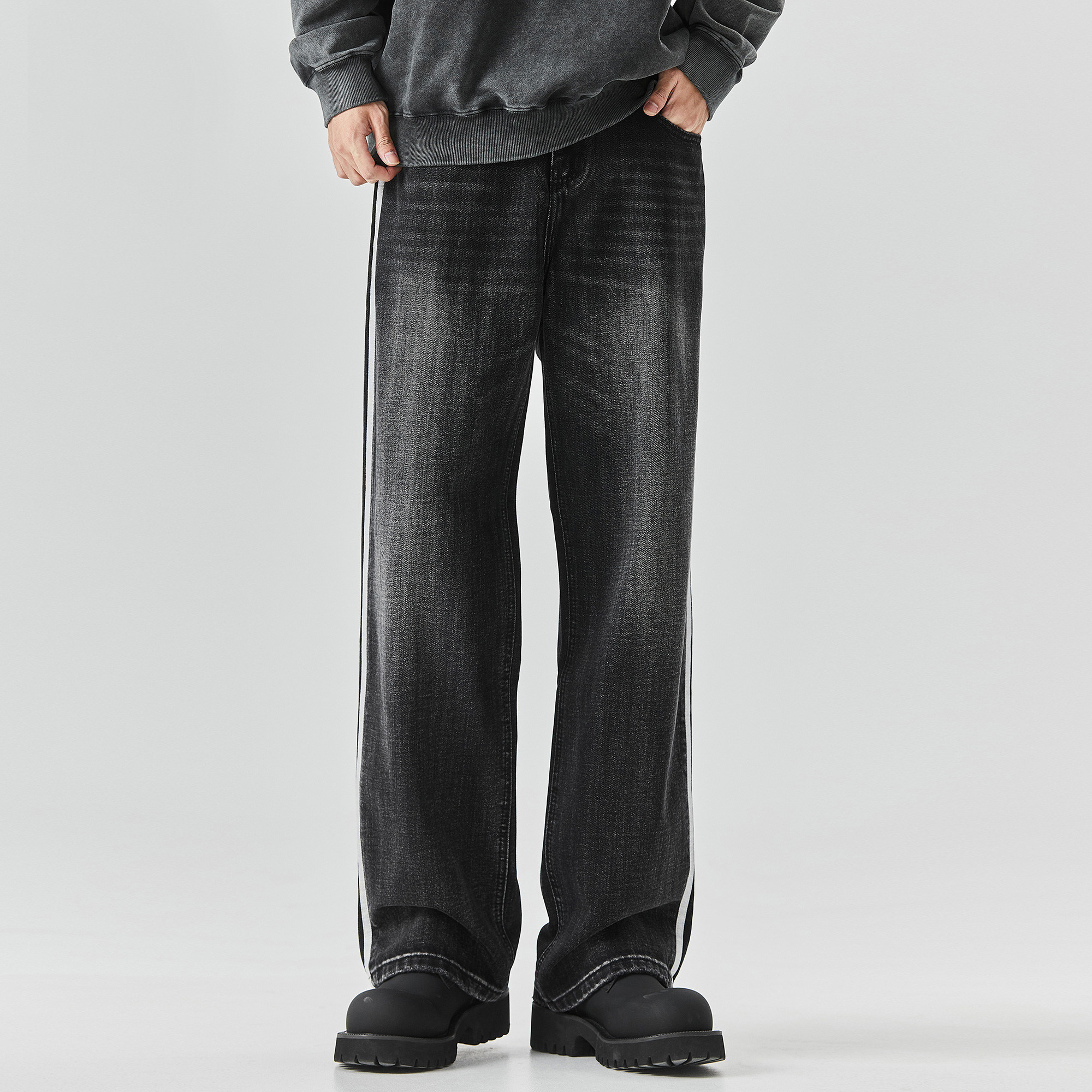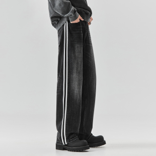 高街黑色宽松直筒阔腿拖地长裤 男春秋美式 子 条纹拼色牛仔裤 ALLIN