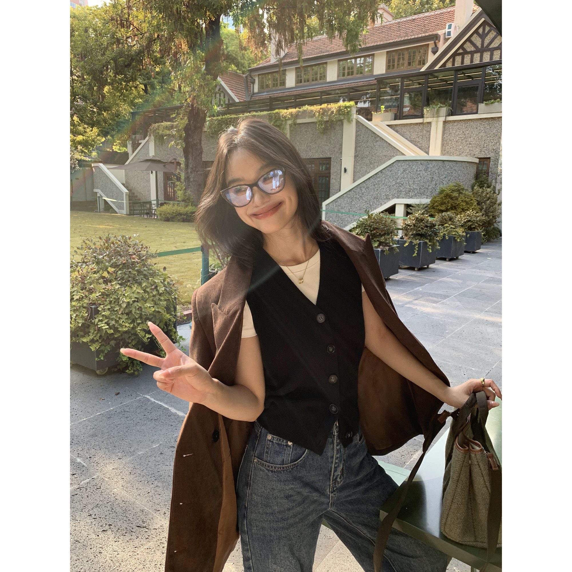 韩系百搭叠穿无袖 马甲女春秋季 坎肩背心上衣 黑色V领开衫 pusumede