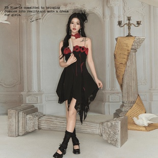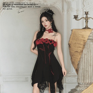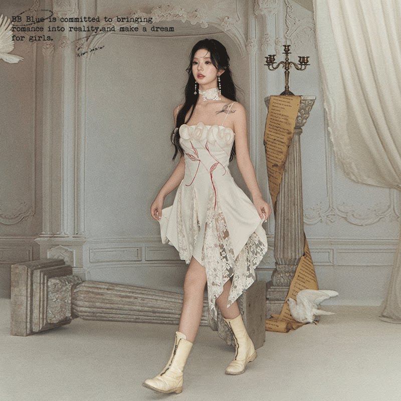 暗黑系重工立体刺绣玫瑰花朵蕾丝不规则连衣裙 原创设计 BLUE