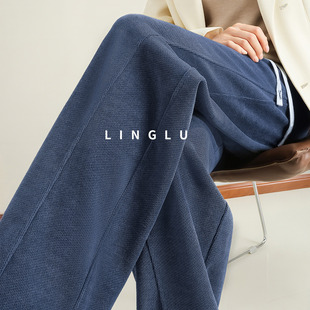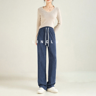 显瘦梨形身材垂感直筒裤 加绒胖mm宽松大码 子 女冬季 条纹阔腿休闲裤