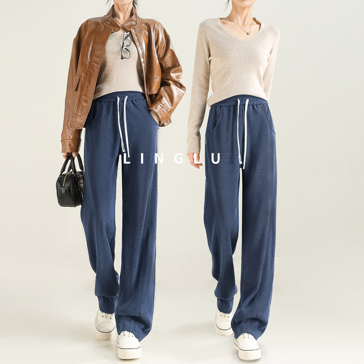 显瘦垂感宽松阔腿运动卫裤 加绒加厚胖mm大码 女冬季 黑色直筒休闲裤