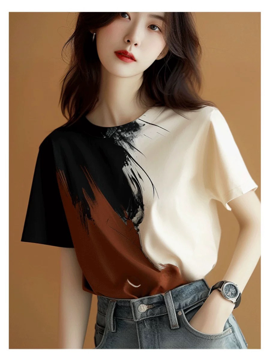 复古晕染 别致新国风200斤大码 正肩短袖 T恤女2025显瘦宽松上衣时尚