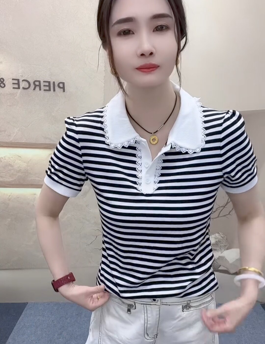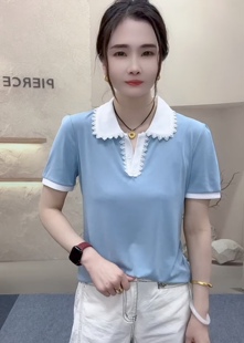 衬衫 polo领条纹百搭休闲减龄短袖 假两件气质上衣外套T恤 时尚 新款