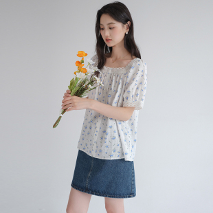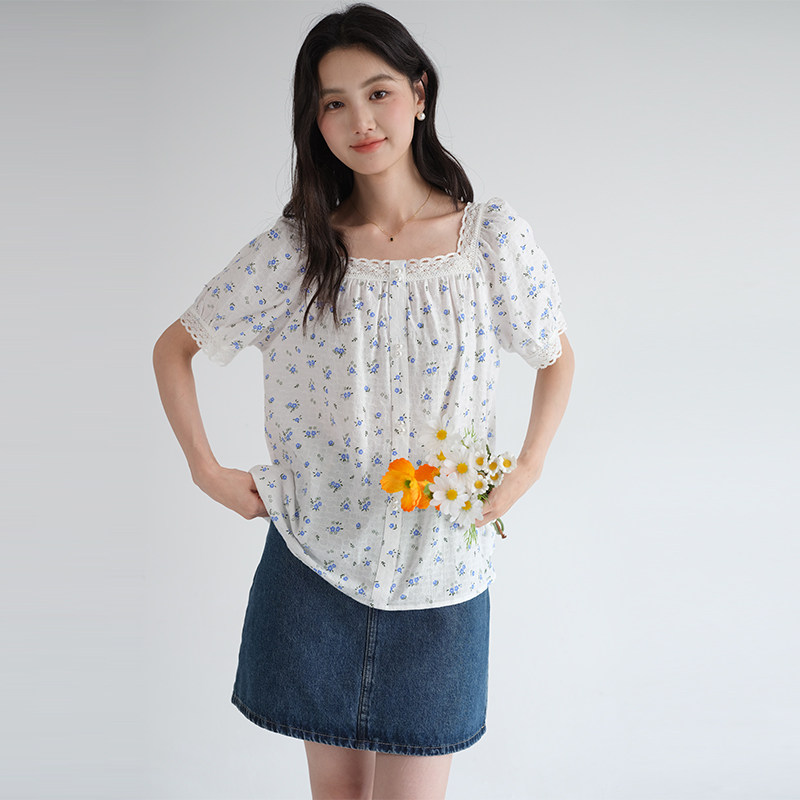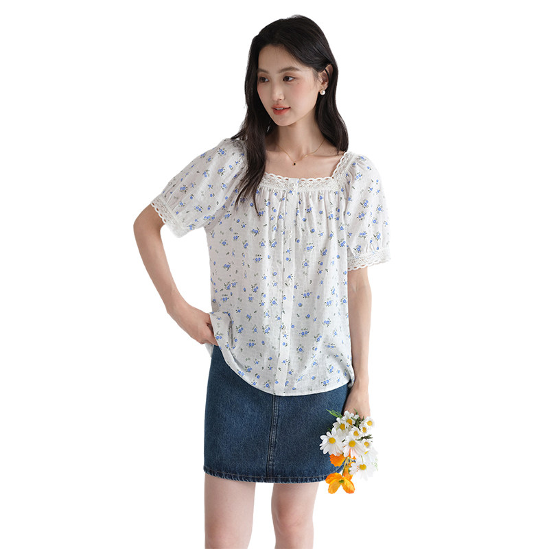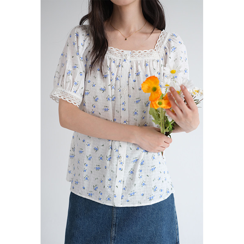 韩系甜美蕾丝方领衬衫 泡泡袖 蓝若水大码 新款 碎花衬衣 2026夏装