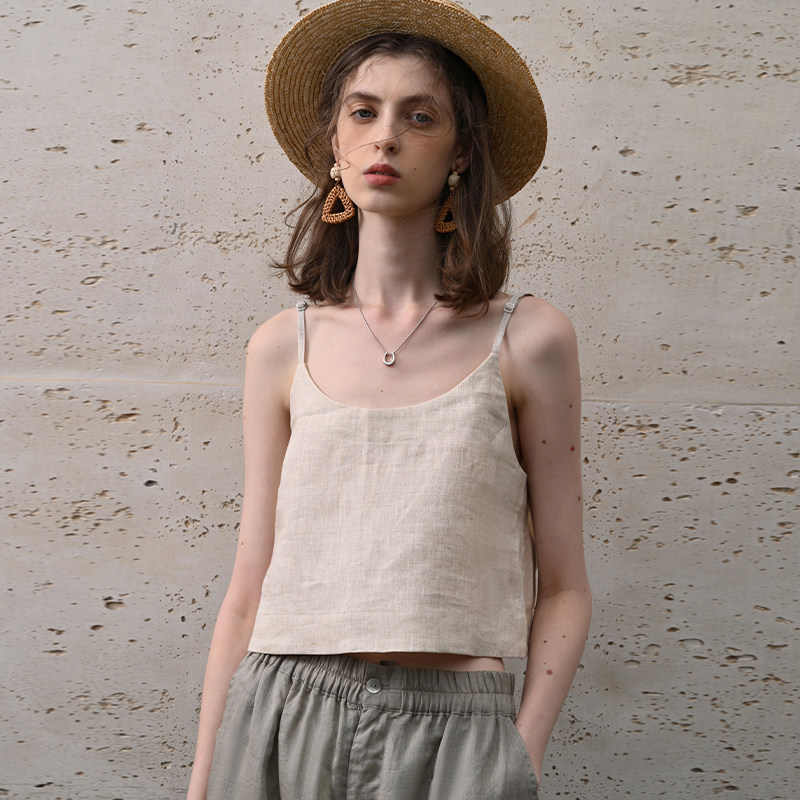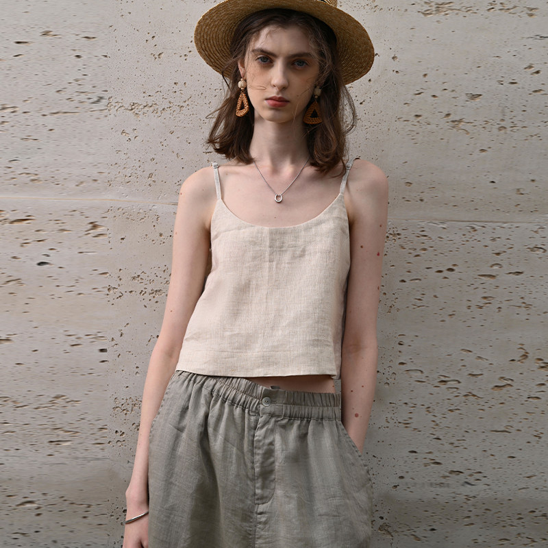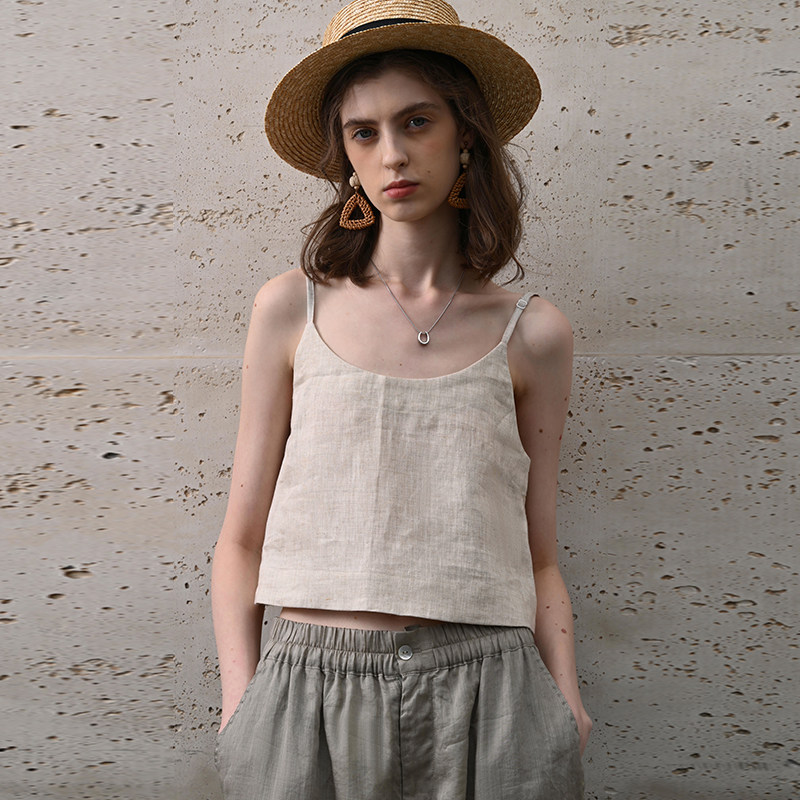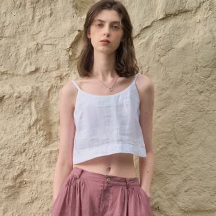 100%纯亚麻吊带背心女内搭夏季 打底 度假宽松性感露肩上衣外穿无袖