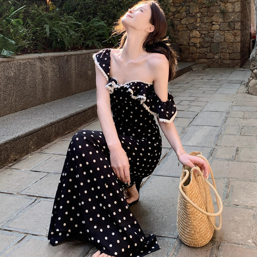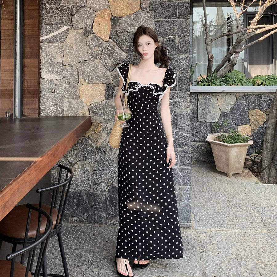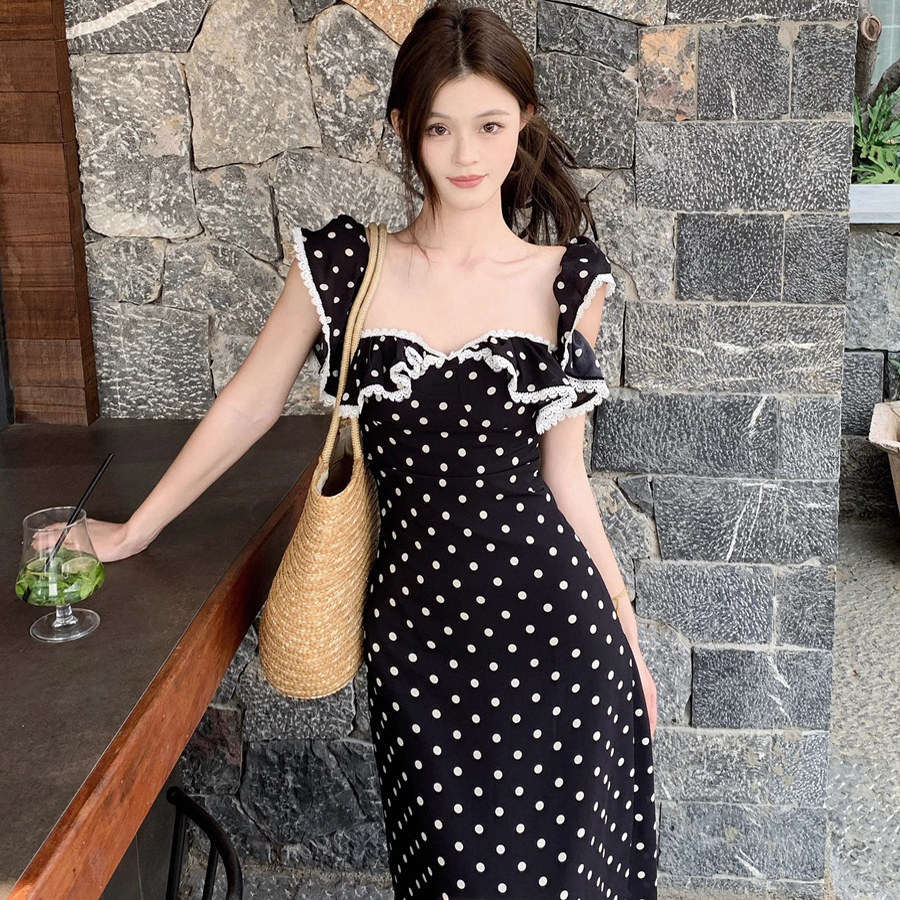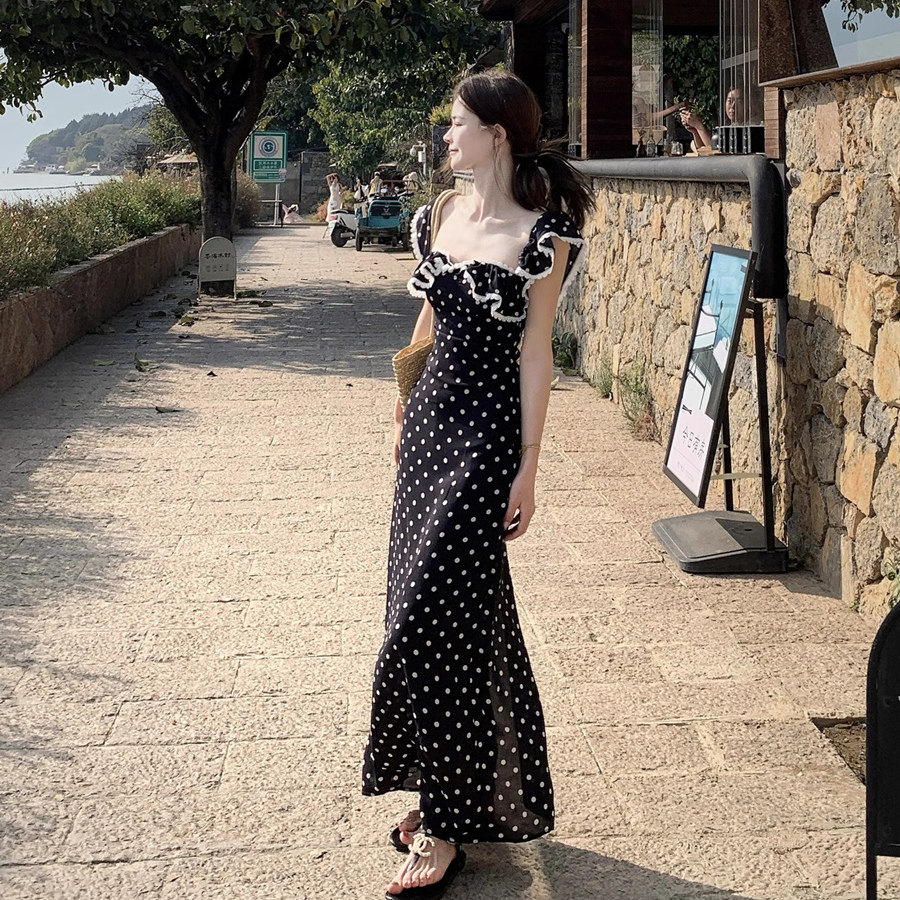 气质蕾丝荷叶边波点连衣裙女夏法式 复古方领收腰A字裙绝美长裙子