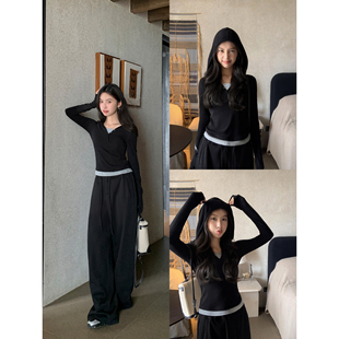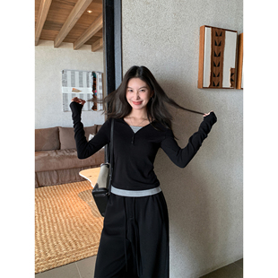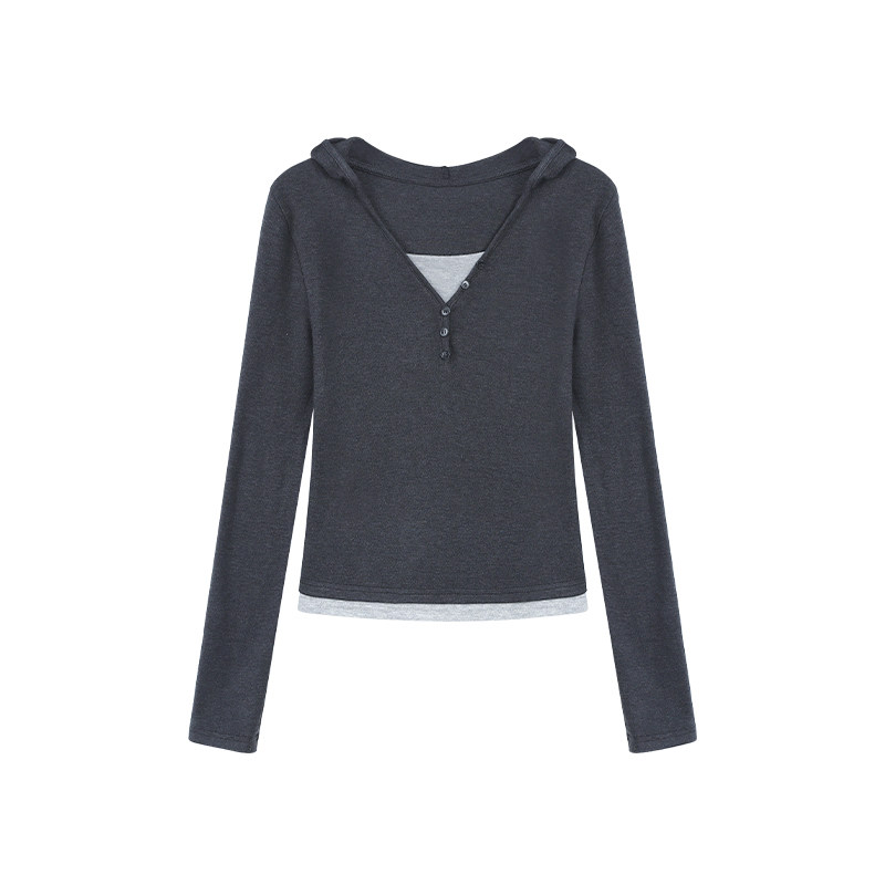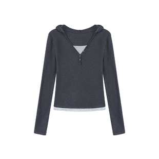 T恤女春秋修身 连帽假两件撞色长袖 休闲上衣 现货7折 MULVAN